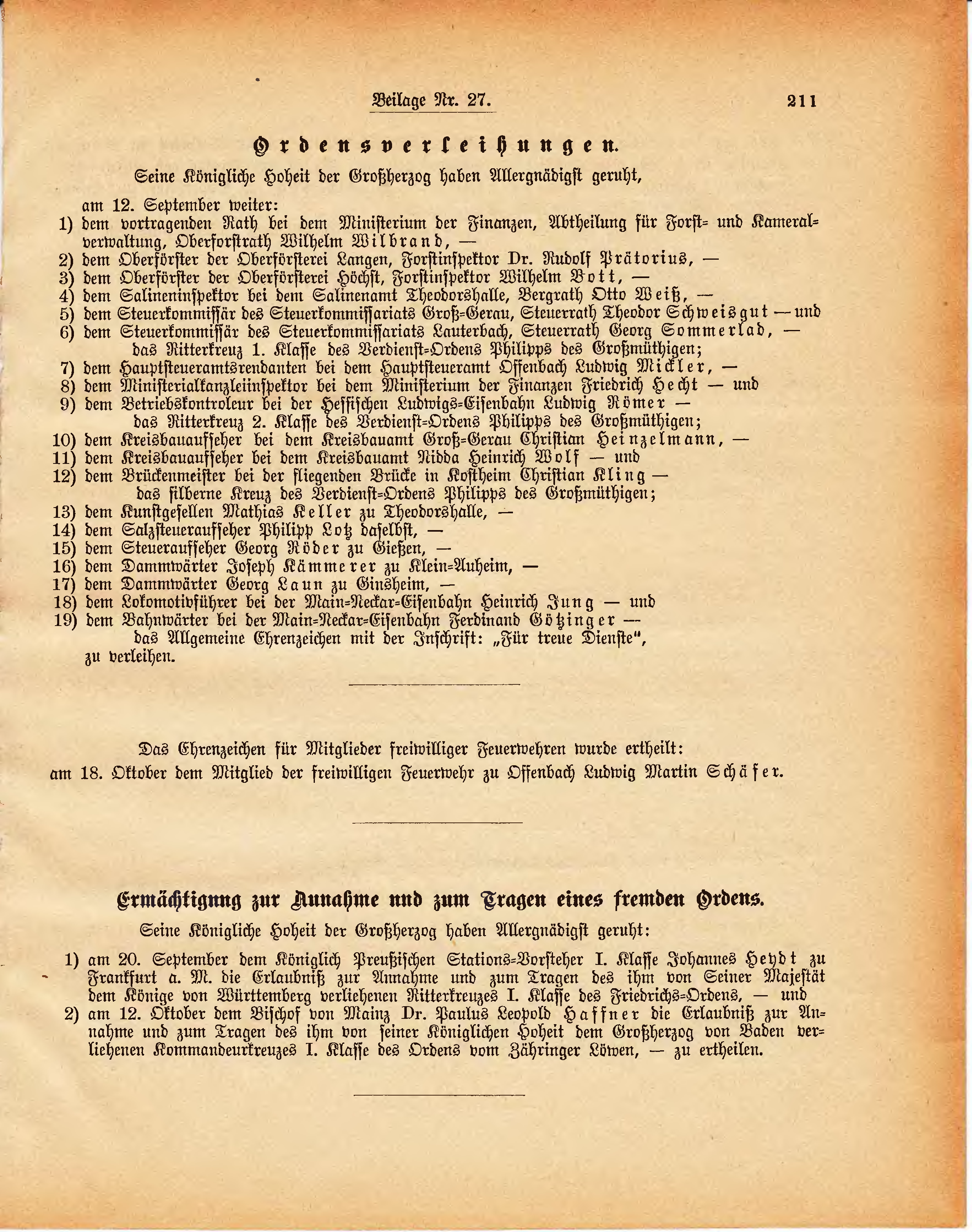 | 1) | am 20. September dem Königlich Preußischen Stations-Vorsteher I. Klasse Johannes Heydt zu Frankfurt a. M. die Erlaubniß zur Annahme und zum Tragen des ihm von Seiner Majestät dem Könige von Württemberg verliehenen Ritterkreuzes I. Klasse des Friedrichs-Ordens, -
