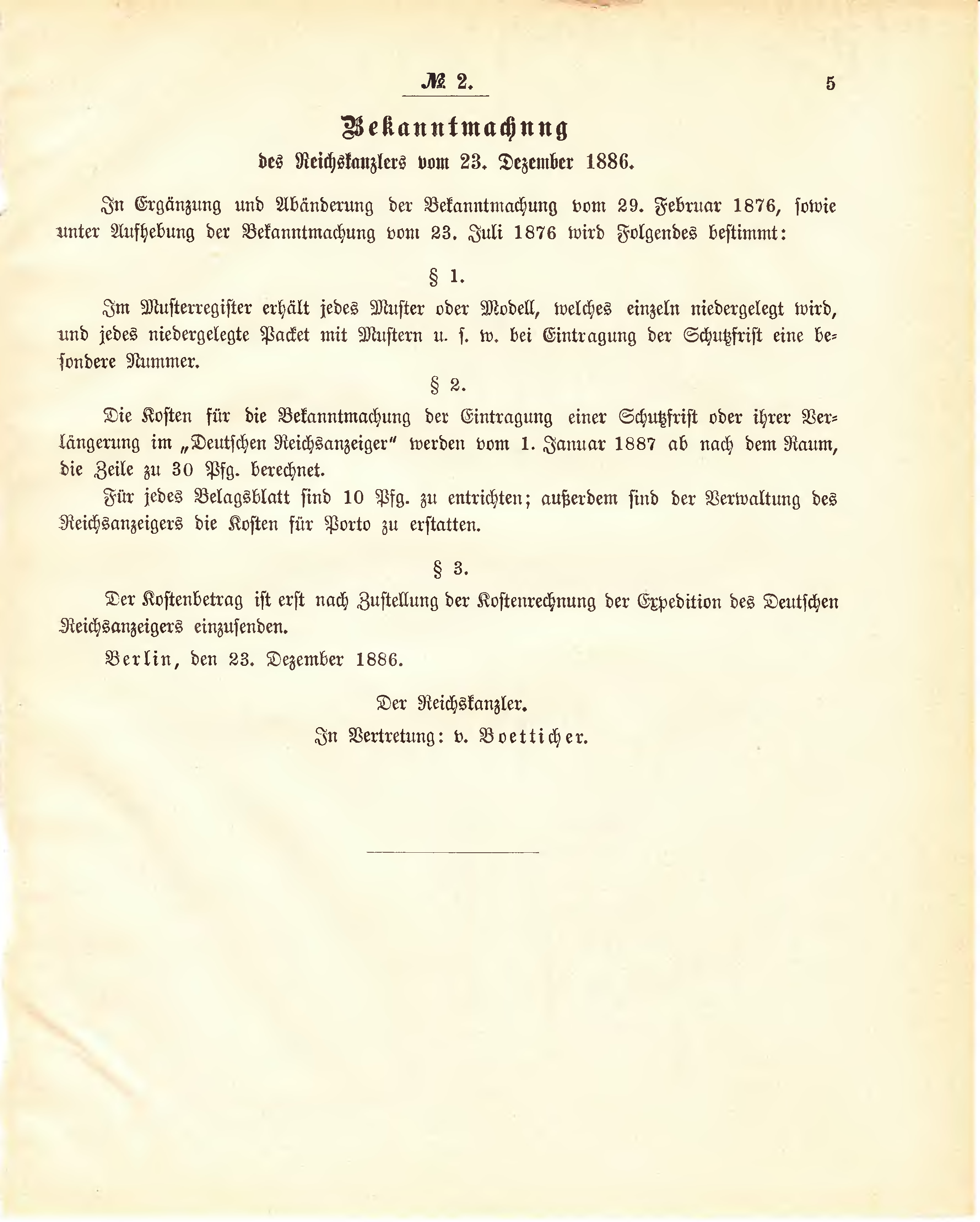 Die Kosten für die Bekanntmachung der Eintragung einer Schutzfrist oder ihrer Verlängerung im "Deutschen Reichsanzeiger" werden vom 1. Januar 1887 ab nach dem Raum, die Zeile zu 30 Pfg. berechnet.