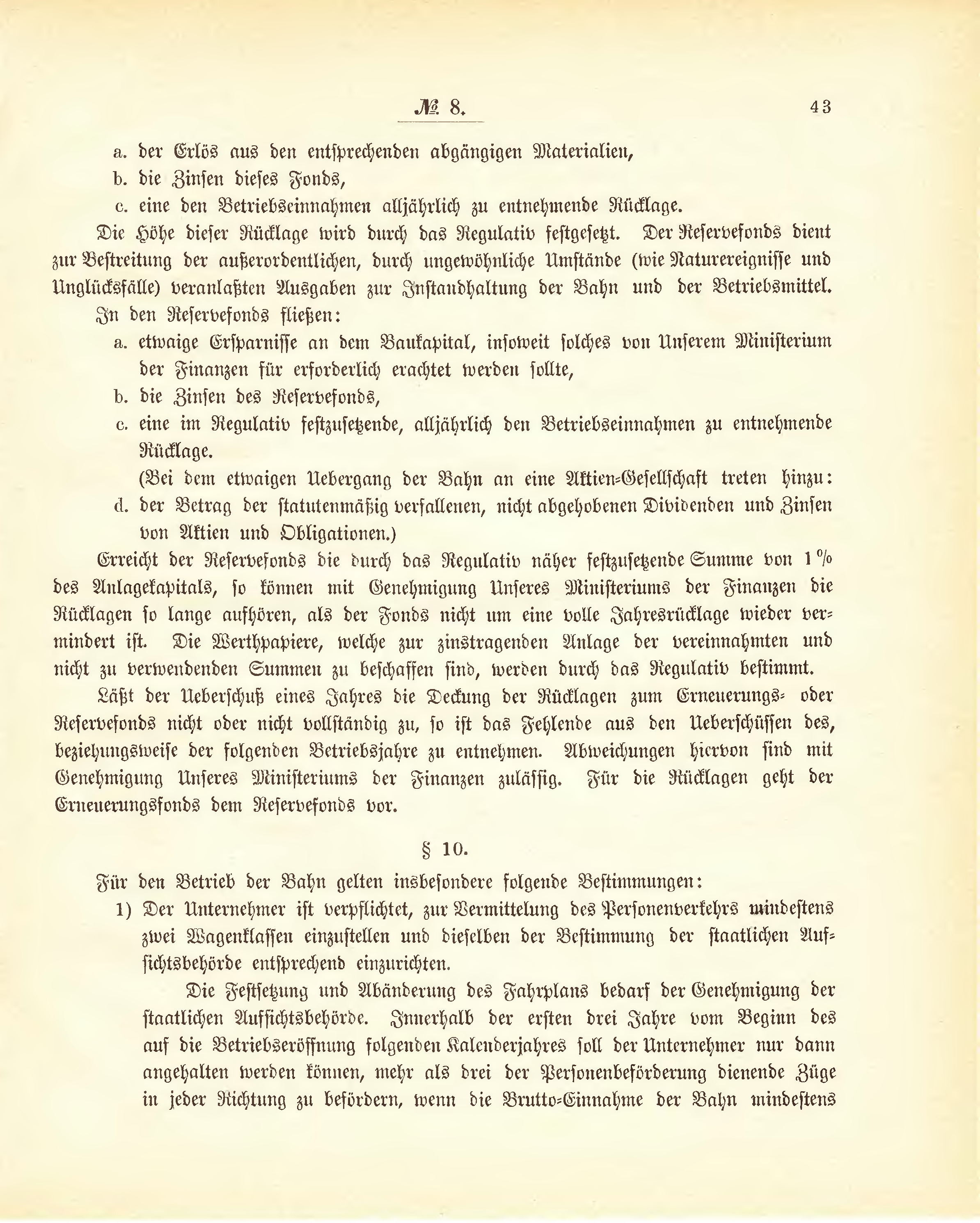 | c. | eine im Regulativ festzusetzende, alljährlich den Betriebseinnahmen zu entnehmende Rücklage. (Bei dem etwaigen Uebergang der Bahn an eine Aktien-Gesellschaft treten hinzu: | |