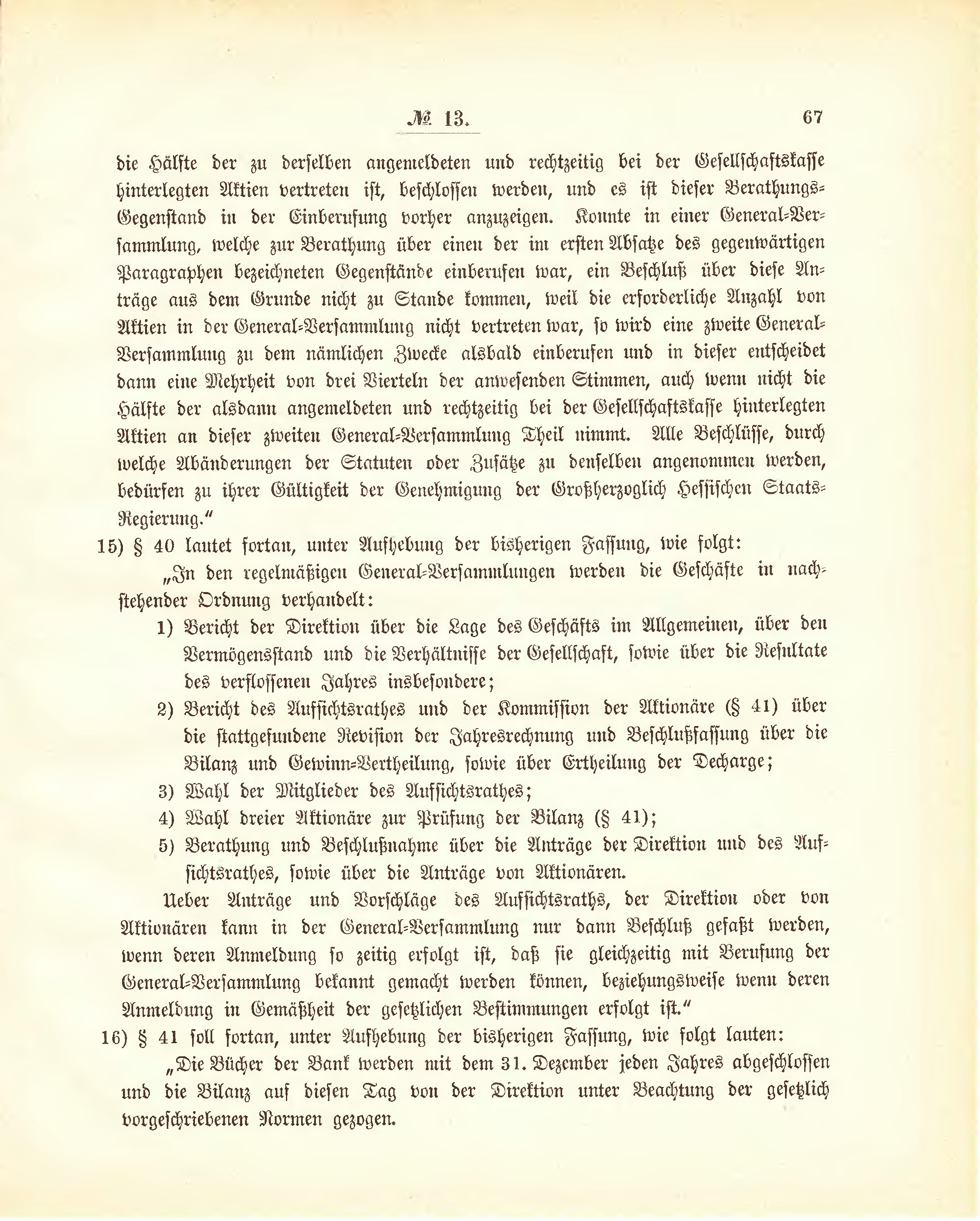 | die Hälfte der zu derselben angemeldeten und rechtzeitig bei der Gesellschaftskasse hinterlegten Aktien vertreten ist, beschlossen werden, und es ist dieser Berathungs-Gegenstand in der Einberufung vorher anzuzeigen. Konnte in einer General-Versammlung, welche zur Berathung über einen der im ersten Absätze des gegenwärtigen Paragraphen bezeichneten Gegenstände einberufen war, ein Beschluß über diese Anträge aus dem Grunde nicht zu Stande kommen, weil die erforderliche Anzahl von Aktien in der General-Versammlung nicht vertreten war, so wird eine zweite General-Versammlung zu dem nämlichen Zwecke alsbald einberufen und in dieser entscheidet dann eine Mehrheit von drei Vierteln der anwesenden Stimmen, auch wenn nicht die Hälfte der alsdann angemeldeten und rechtzeitig bei der Gesellschaftskasse hinterlegten Aktien an dieser zweiten General-Versammlung Theil nimmt. Alle Beschlüsse, durch welche Abänderungen der Statuten oder Zusätze zu denselben angenommen werden, bedürfen zu ihrer Gültigkeit der Genehmigung der Großherzoglich Hessischen Staats-