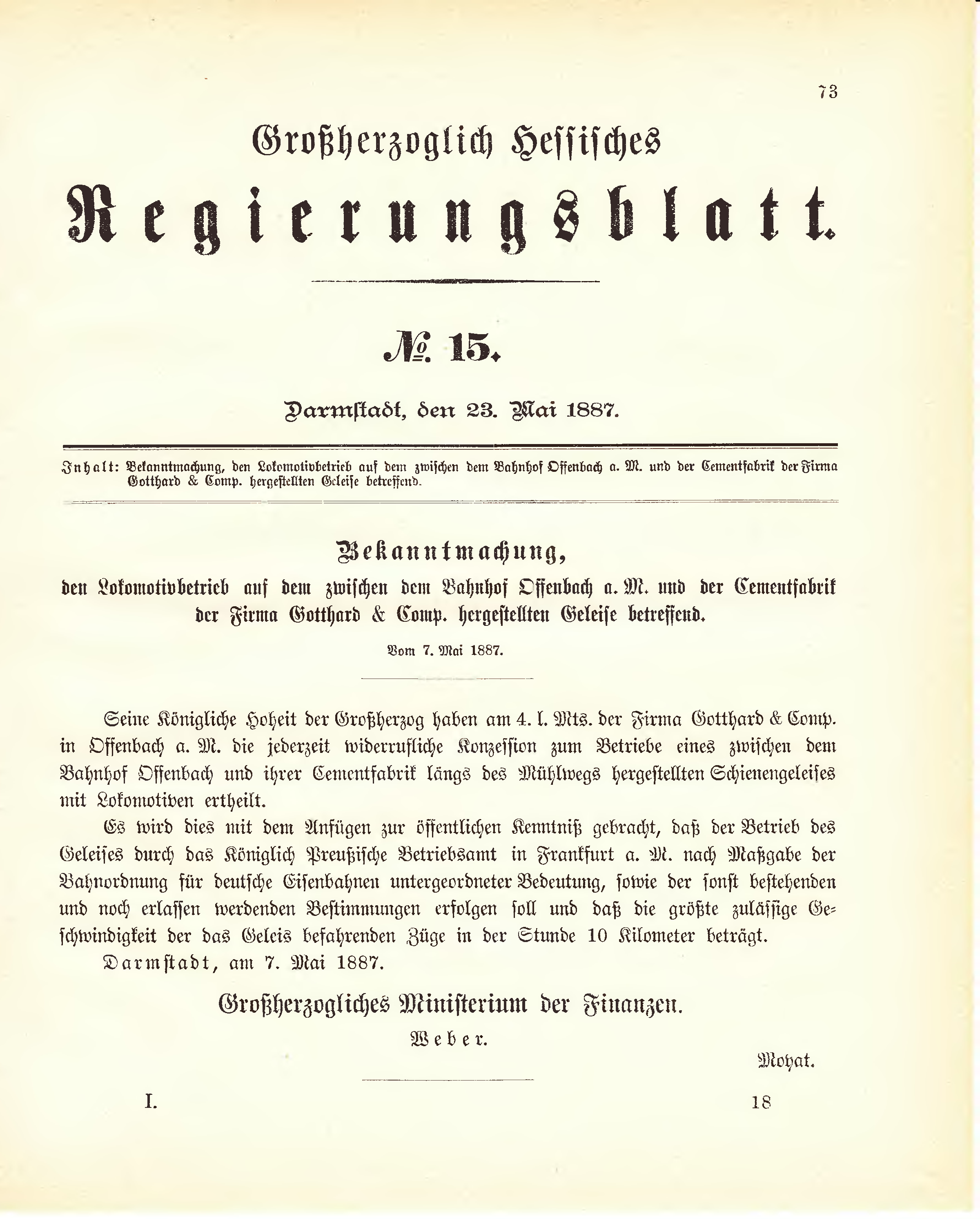 Seine Königliche Hoheit der Großherzog haben am 4. l. Mts. der Firma Gotthard & Comp. in Offenbach a. M. die jederzeit widerrufliche Konzession zum Betriebe eines zwischen dem Bahnhof Offenbach und ihrer Cementfabrik längs des Mühlwegs hergestellten Schienengeleises mit Lokomotiven ertheilt.