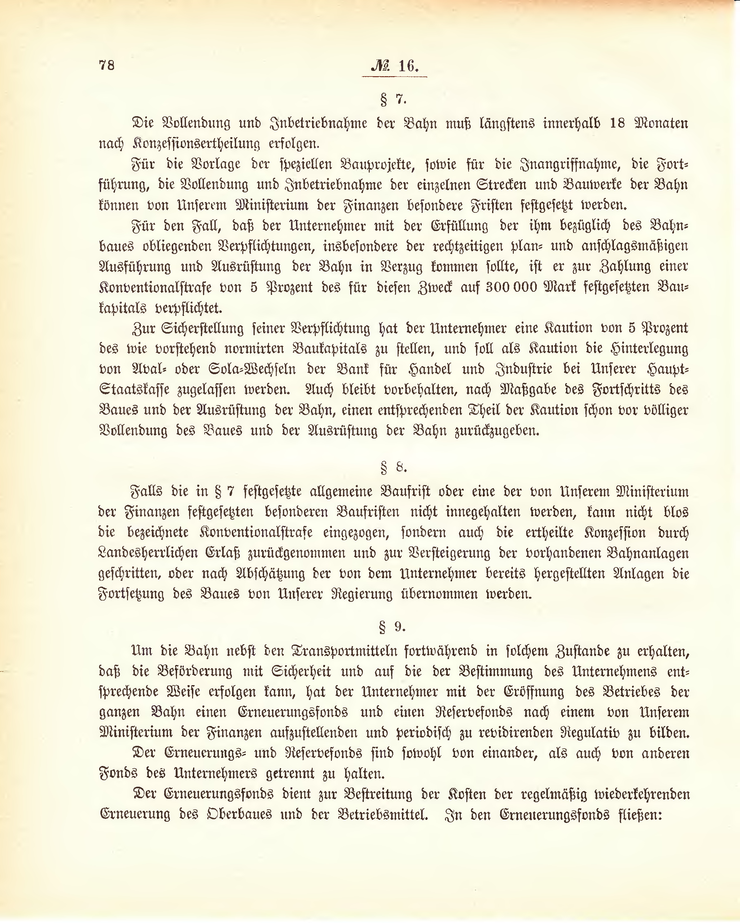 Falls die in § 7 festgesetzte allgemeine Baufrist oder eine der von Unserem Ministerium der Finanzen festgesetzten besonderen Baufristen nicht innegehalten werden, kann nicht blos die bezeichnete Konventionalstrafe eingezogen, sondern auch die ertheilte Konzession durch Landesherrlichen Erlaß zurückgenommen und zur Versteigerung der vorhandenen Bahnanlagen geschritten, oder nach Abschätzung der von dem Unternehmer bereits hergestellten Anlagen die Fortsetzung des Baues von Unserer Regierung übernommen werden.