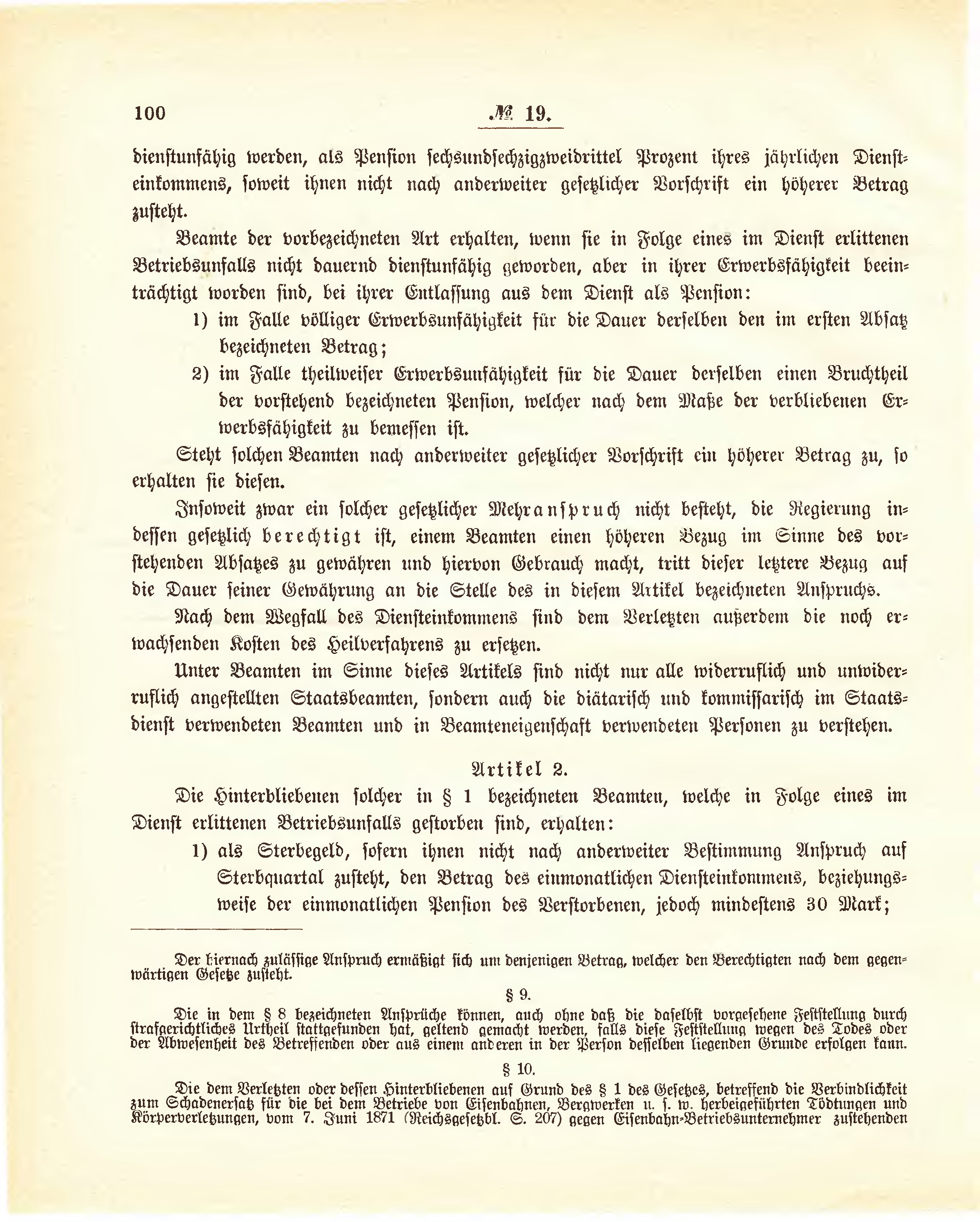 | 2) | im Falle theilweiser Erwerbsunfähigkeit für die Dauer derselben einen Bruchtheil der vorstehend bezeichneten Pension, welcher nach dem Maße der verbliebenen Erwerbsfähigkeit zu bemessen ist. |