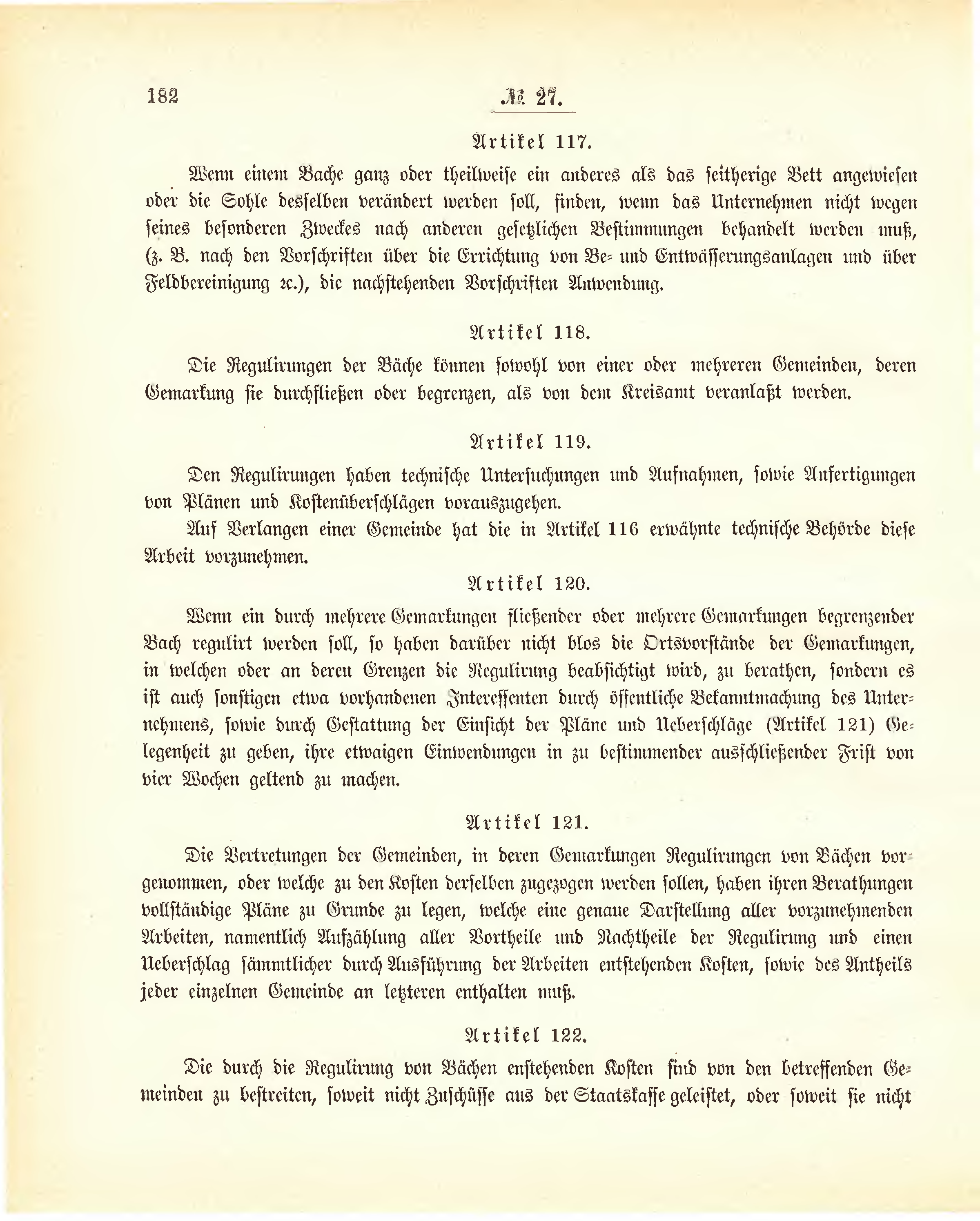 Die durch die Regulirung von Bächen entstehenden[GWR 1] Kosten sind von den betreffenden Gemeinden zu bestreiten, soweit nicht Zuschüsse aus der Staatskasse geleistet, oder soweit sie nicht