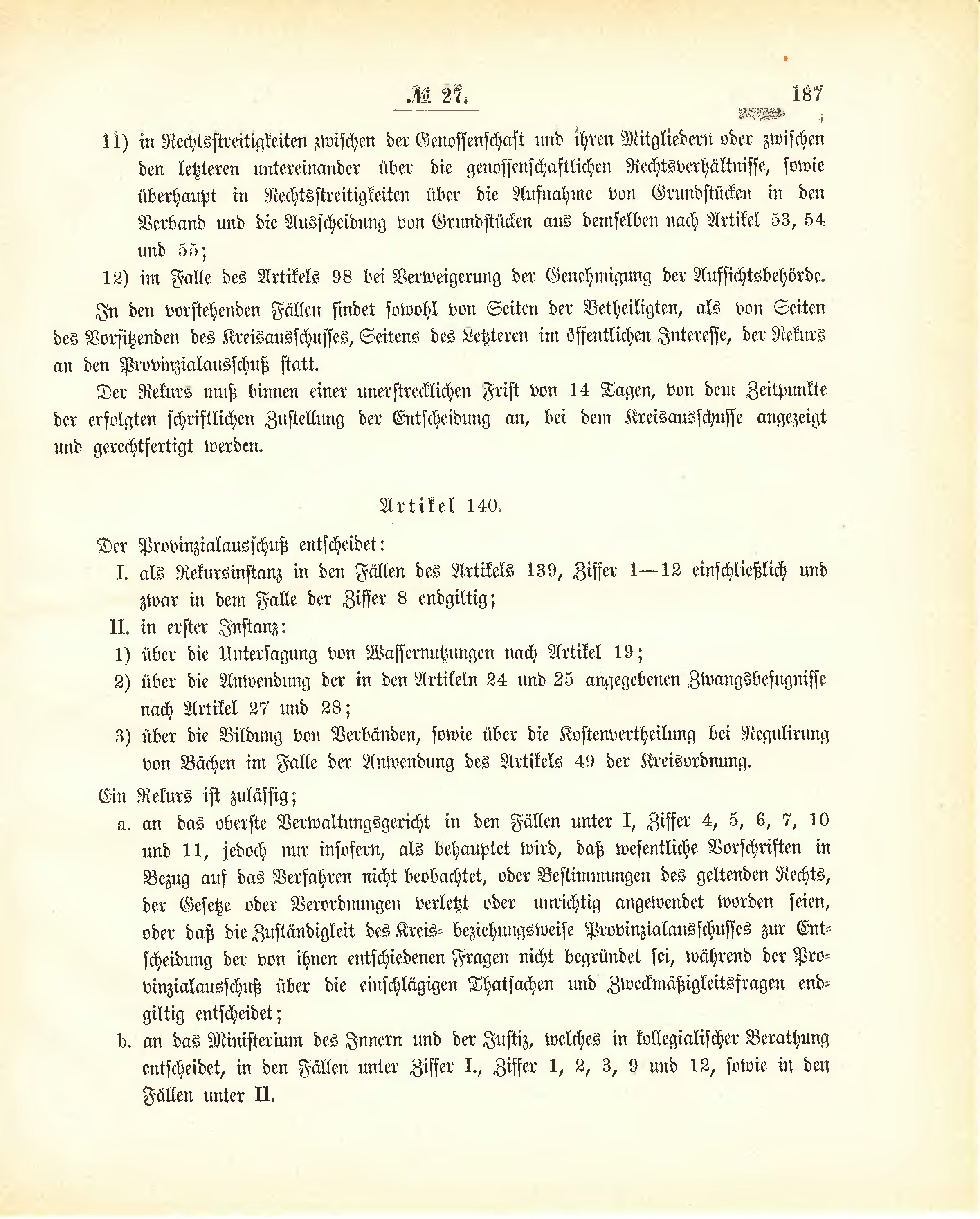 | 11) | in Rechtsstreitigkeiten zwischen der Genossenschaft und ihren Mitgliedern oder zwischen den letzteren untereinander über die genossenschaftlichen Rechtsverhältnisse, sowie überhaupt in Rechtsstreitigkeiten über die Aufnahme von Grundstücken in den Verband und die Ausscheidung von Grundstücken aus demselben nach Artikel 53, 54 und 55; | |