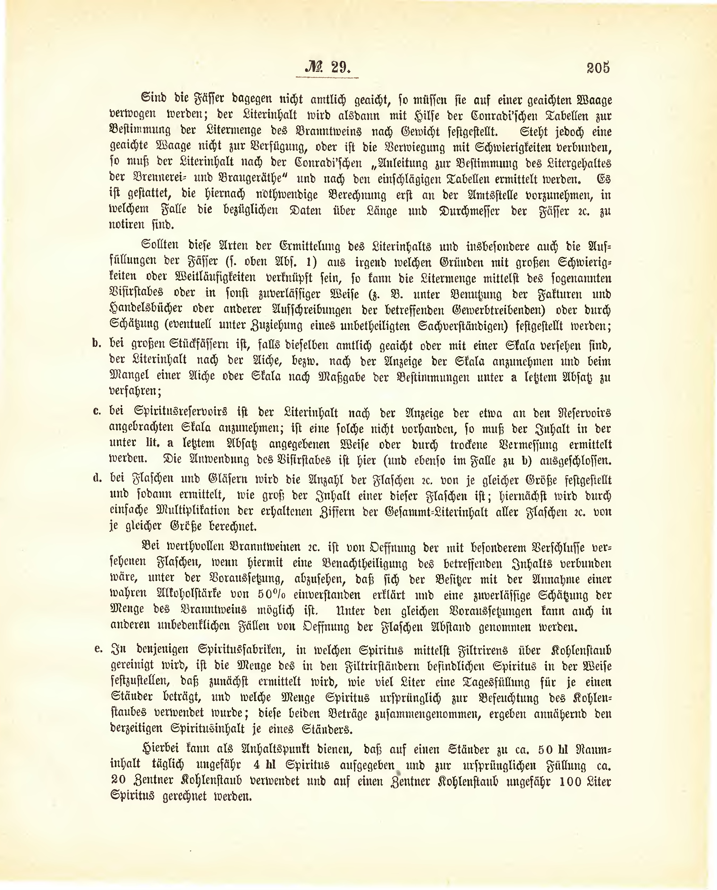 | Sind die Fässer dagegen nicht amtlich geaicht, so müssen sie auf einer geaichten Waage verwogen werden; der Literinhalt wird alsdann mit Hilfe der Conradi`schen[GWR 1] Tabellen zur Bestimmung der Litermenge des Branntweins nach Gewicht festgestellt. Steht jedoch eine geaichte Waage nicht zur Verfügung, oder ist die Verwiegung mit Schwierigkeiten verbunden, so muß der Literinhalt nach der Conradi`schen "Anleitung zur Bestimmung des Litergehaltes der Brennerei- und Braugeräthe"[GWR 1] und nach den einschlägigen Tabellen ermittelt werden. Es ist gestattet, die hiernach nothwendige Berechnung erst an der Amtsstelle vorzunehmen, in welchem Falle die bezüglichen Daten über Länge und Durchmesser der Fässer etc. zu notiren sind. Sollten diese Arten der Ermittelung des Literinhalts und insbesondere auch die Auffüllungen der Fässer (s. oben Abs. 1) aus irgend welchen Gründen mit großen Schwierigkeiten oder Weitläufigkeiten verknüpft sein, so kann die Litermenge mittelst des sogenannten Visirstabes oder in sonst zuverlässiger Weise (z. B. unter Benutzung der Fakturen und Handelsbücher oder anderer Ausschreibungen der betreffenden Gewerbtreibenden) oder durch Schätzung (eventuell unter Zuziehung eines unbetheiligten Sachverständigen) festgestellt werden; | |