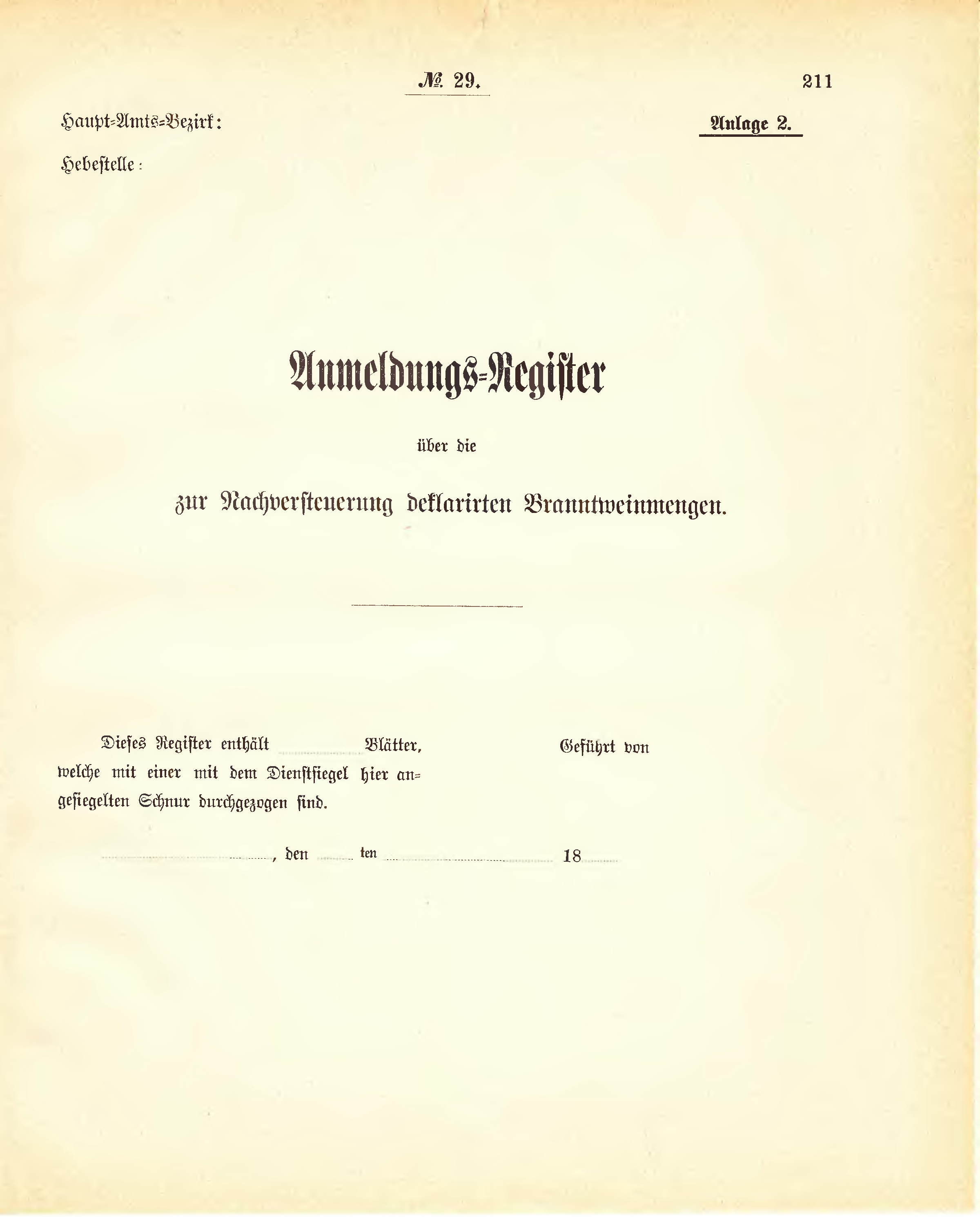 | Dieses Register enthält .. .. .. .. .. Blätter, welche mit einer mit dem Dienstsiegel hier an- gesiegelten Schnur durchgezogen sind. |