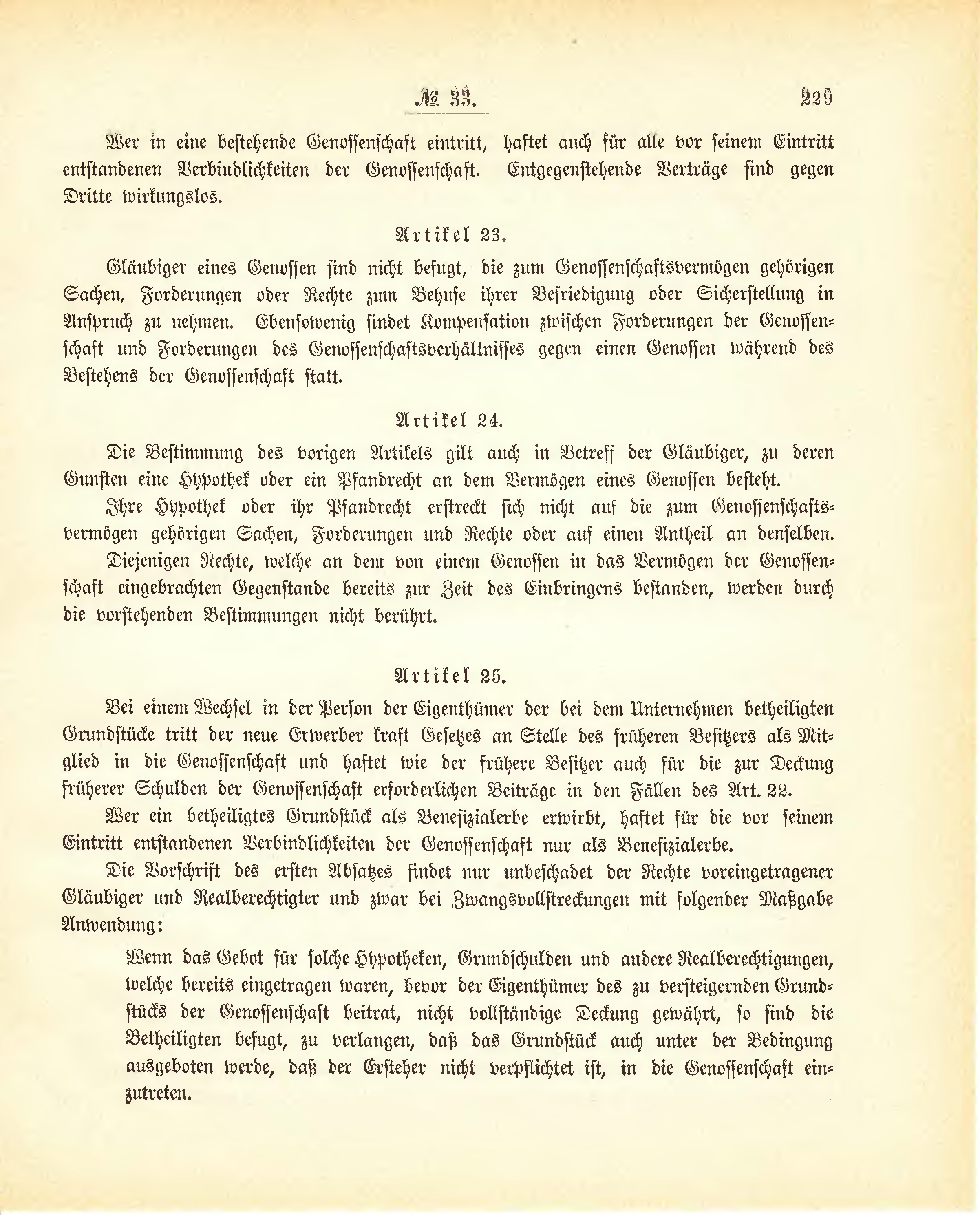 Bei einem Wechsel in der Person der Eigenthümer der bei dem Unternehmen betheiligten Grundstücke tritt der neue Erwerber kraft Gesetzes an Stelle des früheren Besitzers als Mitglied in die Genossenschaft und haftet wie der frühere Besitzer auch für die zur Deckung früherer Schulden der Genossenschaft erforderlichen Beiträge in den Fällen des Art. 22.