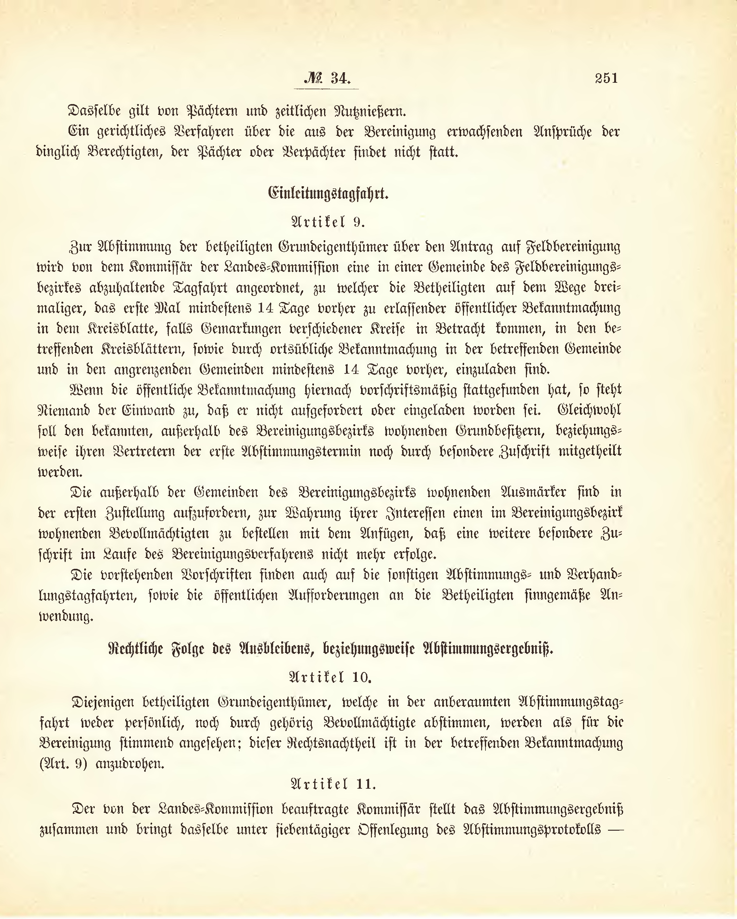 Zur Abstimmung der betheiligten Grundeigenthümer über den Antrag auf Feldbereinigung wird von dem Kommissar der Landes-Kommission eine in einer Gemeinde des Feldbereinigungsbezirkes abzuhaltende Tagfahrt angeordnet, zu welcher die Betheiligten auf dem Wege dreimaliger, das erste Mal mindestens 14 Tage vorher zu erlassender öffentlicher Bekanntmachung in dem Kreisblatte, falls Gemarkungen verschiedener Kreise in Betracht kommen, in den betreffenden Kreisblättern, sowie durch ortsübliche Bekanntmachung in der betreffenden Gemeinde und in den angrenzenden Gemeinden mindestens 14 Tage vorher, einzuladen sind.