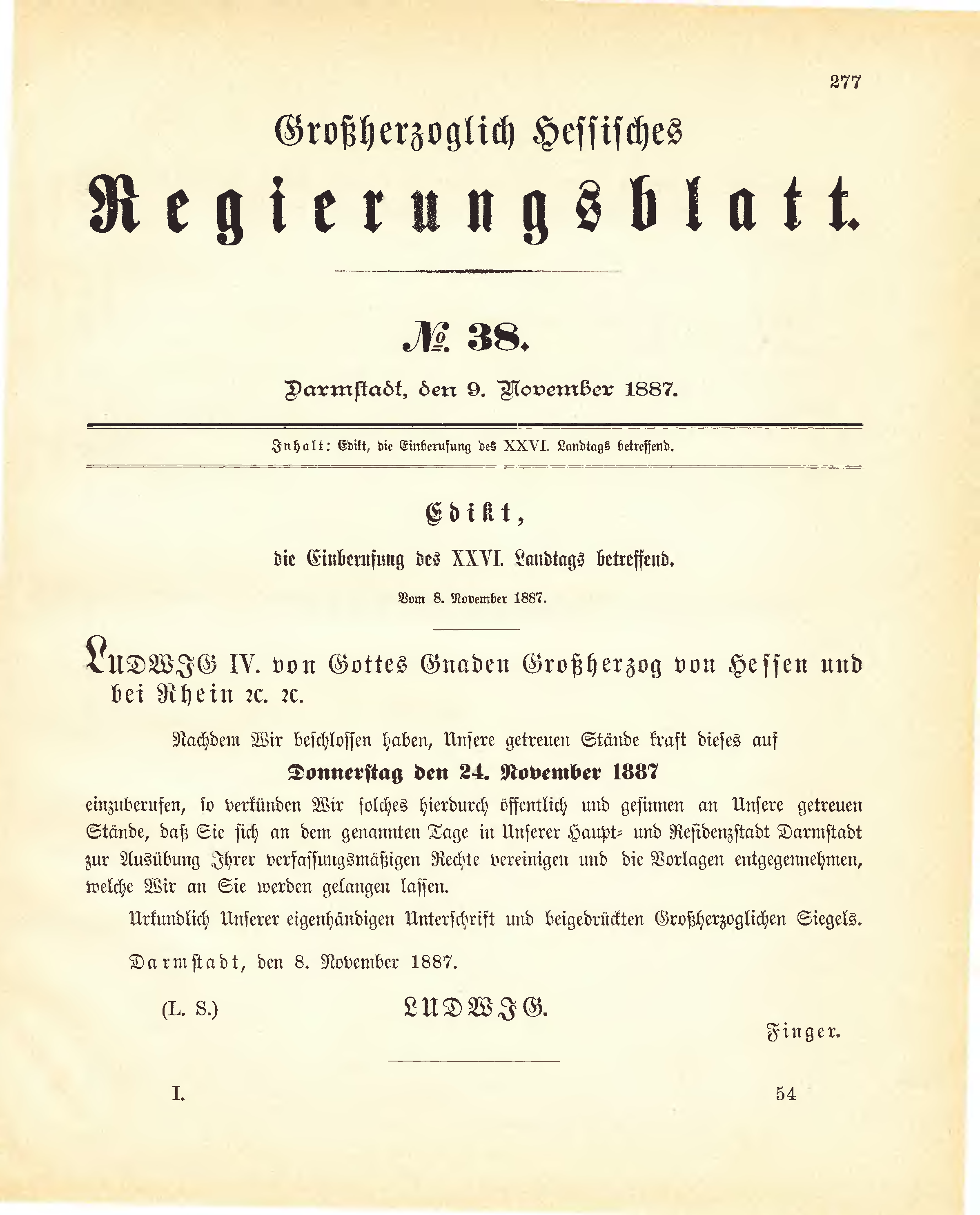 einzuberufen, so verkünden Wir solches hierdurch öffentlich und gesinnen an Unsere getreuen Stände, daß Sie sich an dem genannten Tage in Unserer Haupt- und Residenzstadt Darmstadt zur Ausübung Ihrer verfassungsmäßigen Rechte vereinigen und die Vorlagen entgegennehmen, welche Wir an Sie werden gelangen lassen.