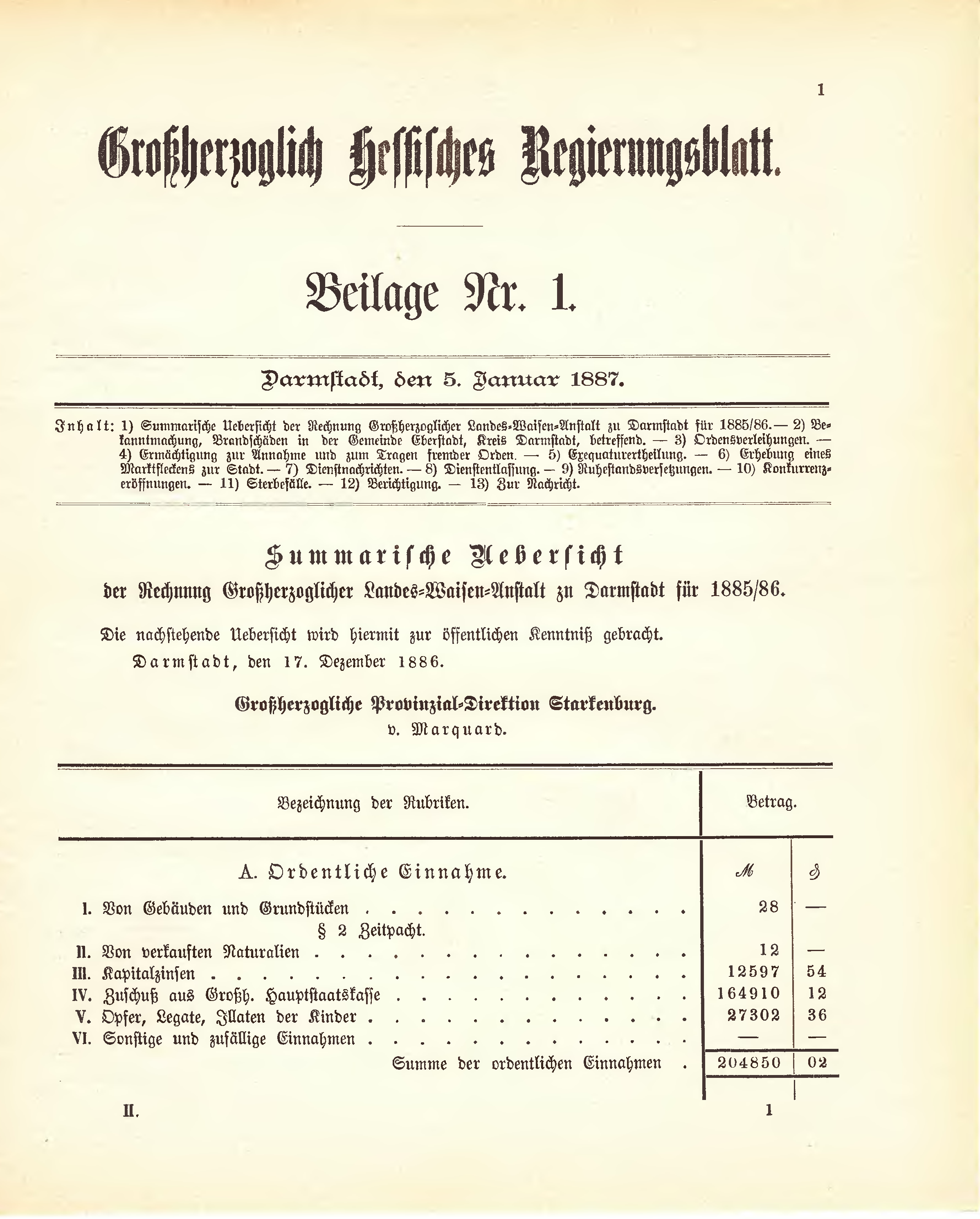 der Rechnung Großherzoglicher Landes-Waisen-Anstalt zu Darmstadt für 1885/86.