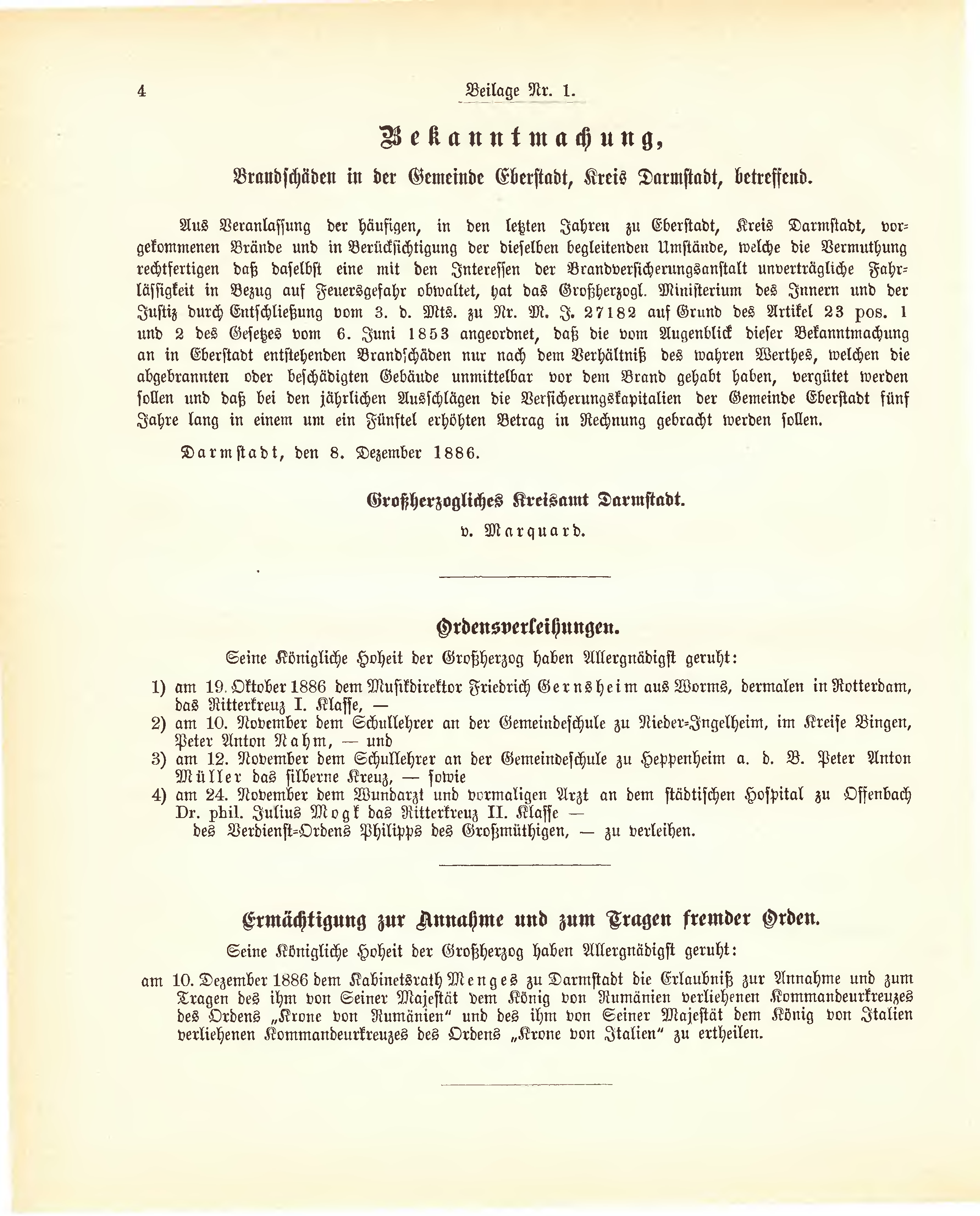am 10. Dezember 1886 dem Kabinetsrath Menges zu Darmstadt die Erlaubniß zur Annahme und zum Tragen des ihm von Seiner Majestät