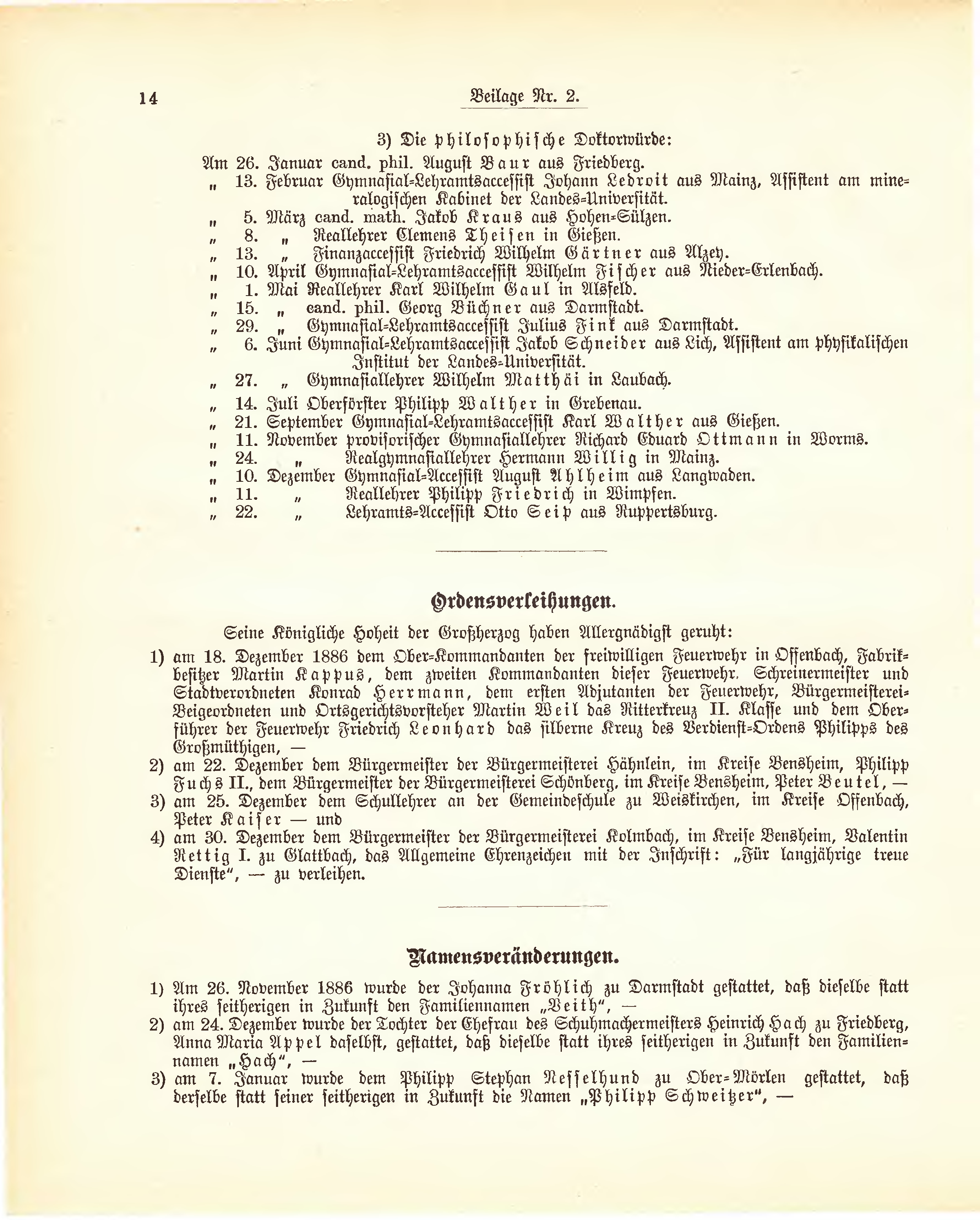 1) am 18. Dezember 1886 dem Ober-Kommandanten der freiwilligen Feuerwehr in Offenbach, Fabrikbesitzer Martin Kappus, dem zweiten Kommandanten dieser Feuerwehr, Schreinermeister und Stadtverordneten Konrad Herrmann, dem ersten Adjutanten der Feuerwehr, Bürgermeisterei-Beigeordneten und Ortsgerichtsvorsteher Martin Weil das Ritterkreuz II. Klasse und dem Oberführer der Feuerwehr Friedrich Leonhard das silberne Kreuz des Verdienst-Ordens Philipps des Großmüthigen, -