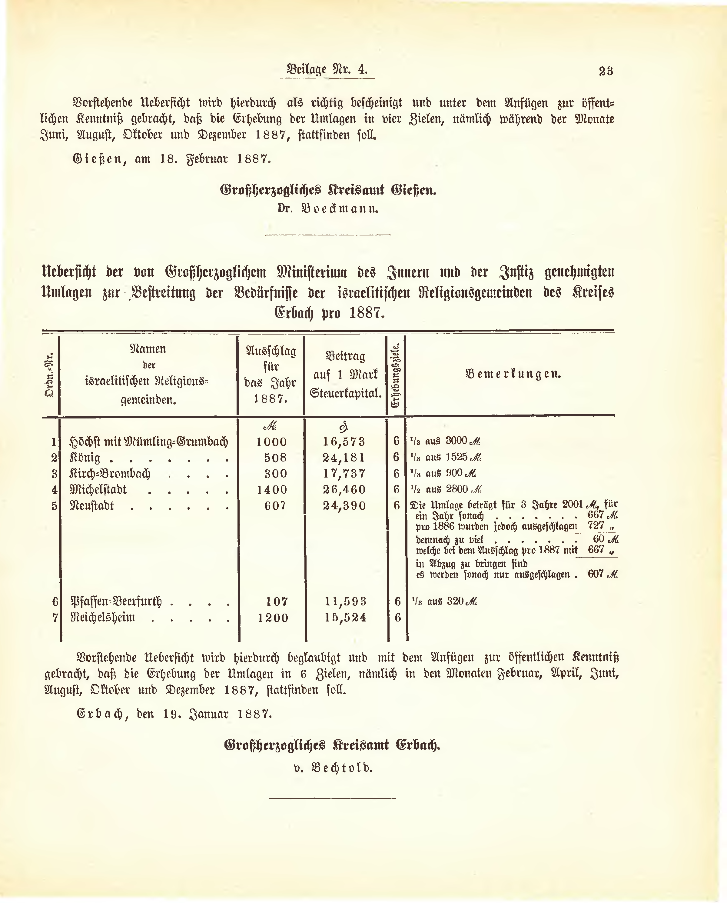 Uebersicht der von Großherzoglichem Ministerium des Innern und der Justiz genehmigten Umlagen zur Bestreitung der Bedürfnisse der israelitischen Religionsgemeinden des Kreises Erbach pro 1887.