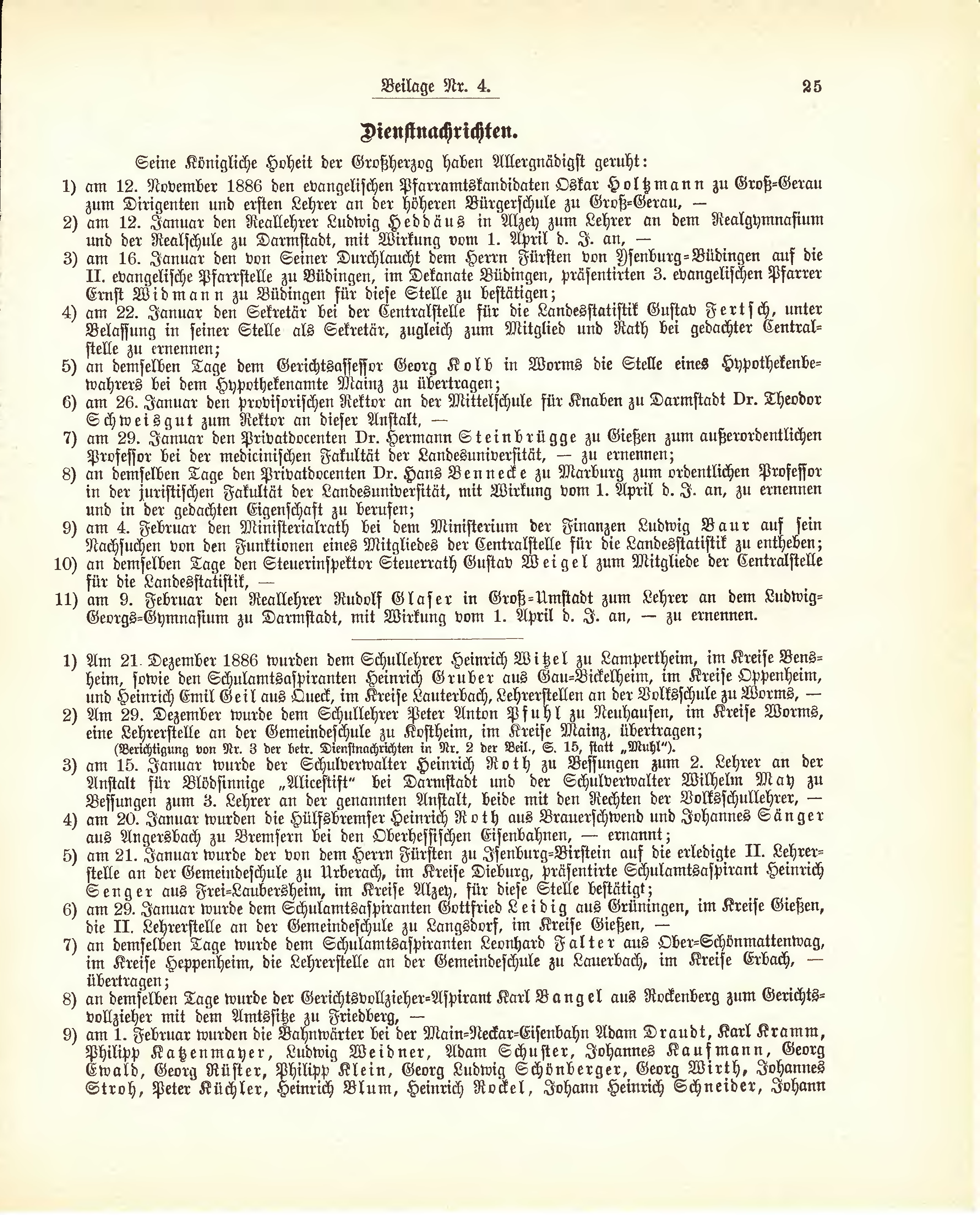 1) am 12. November 1886 den evangelischen Pfarramtskandidaten Oskar Holtzmann zu Groß-Gerau zum Dirigenten und ersten Lehrer an der höheren Bürgerschule zu Groß-Gerau, -
