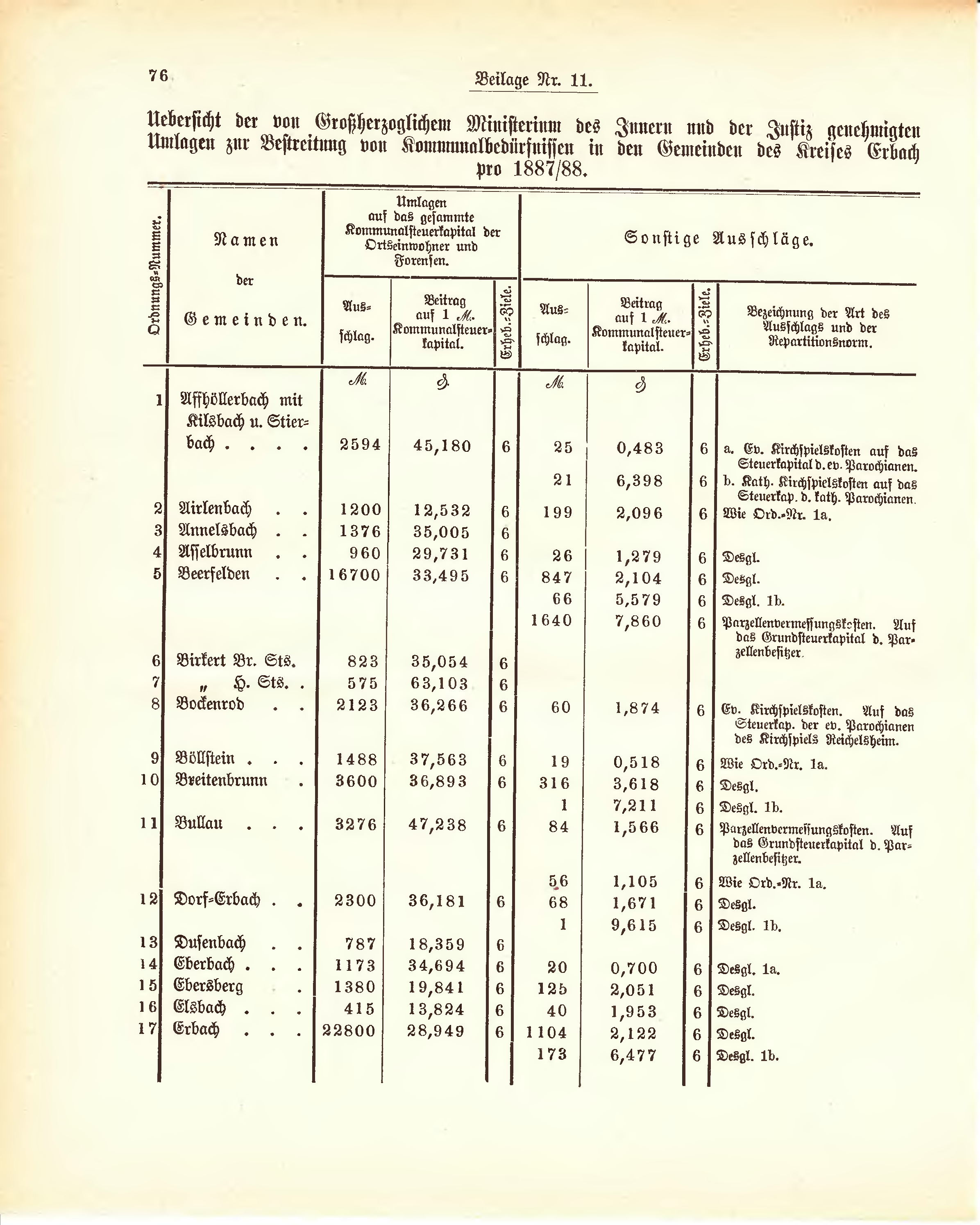 Uebersicht der von Großherzoglichem Ministerium des Innern und der Justiz genehmigten Umlagen zur Bestreitung von Kommunalbedürfnissen in den Gemeinden des Kreises Erbach pro 1887/88.