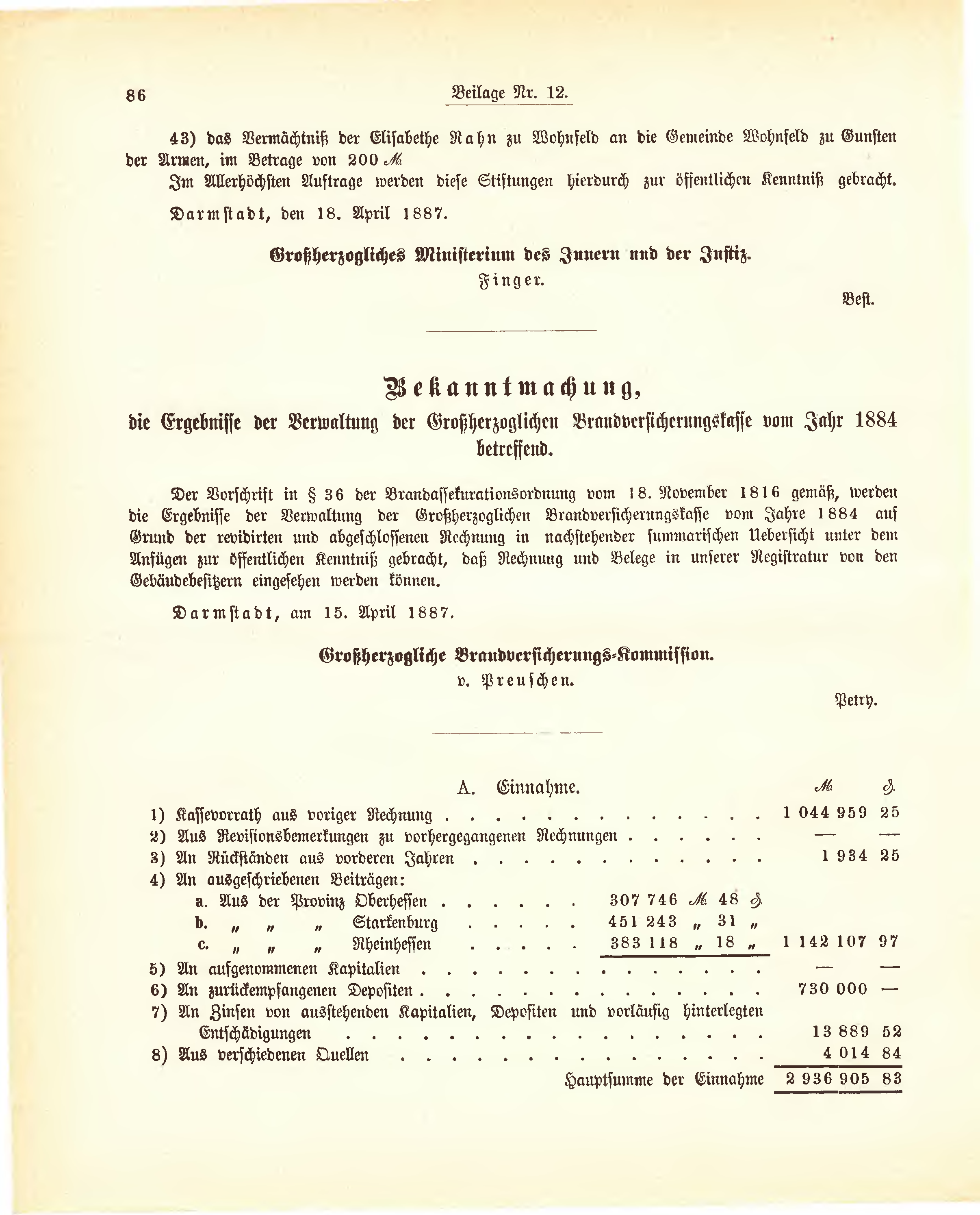 Der Vorschrift in § 36 der Brandassekurationsordnung vom 18. November 1816 gemäß, werden die Ergebnisse der Verwaltung der Großherzoglichen Brandversicherungskasse vom Jahre 1884 auf Grund der revidirten und abgeschlossenen Rechnung in nachstehender summarischen Uebersicht unter dem Anfügen zur öffentlichen Kenntniß gebracht, daß Rechnung und Belege in unserer Registratur von den Gebäudebesitzern eingesehen werden können.