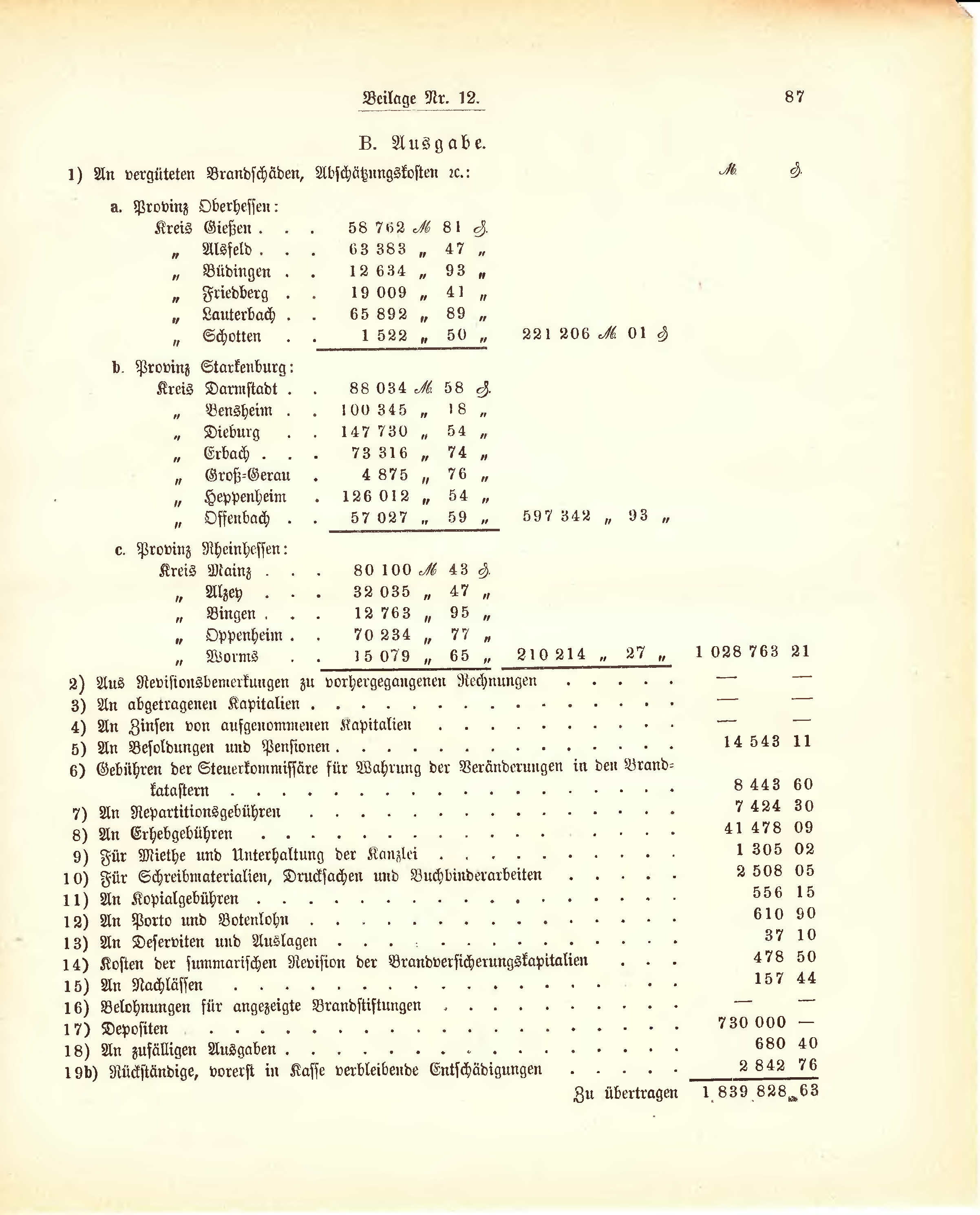 1) An vergüteten Brandschäden, Abschätzungskosten etc.: