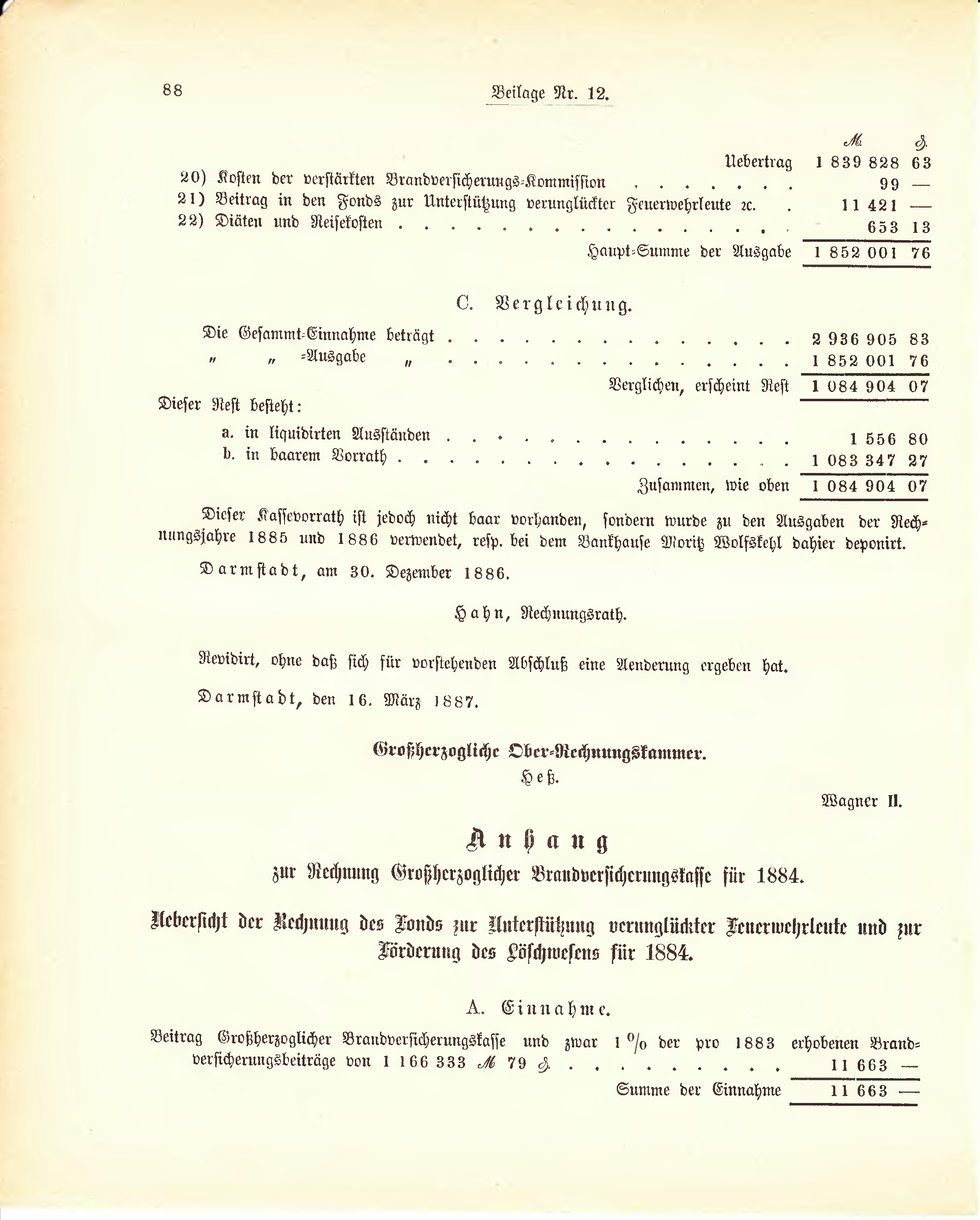 zur Rechnung Großherzoglicher Brandversicherungskasse für 1884.