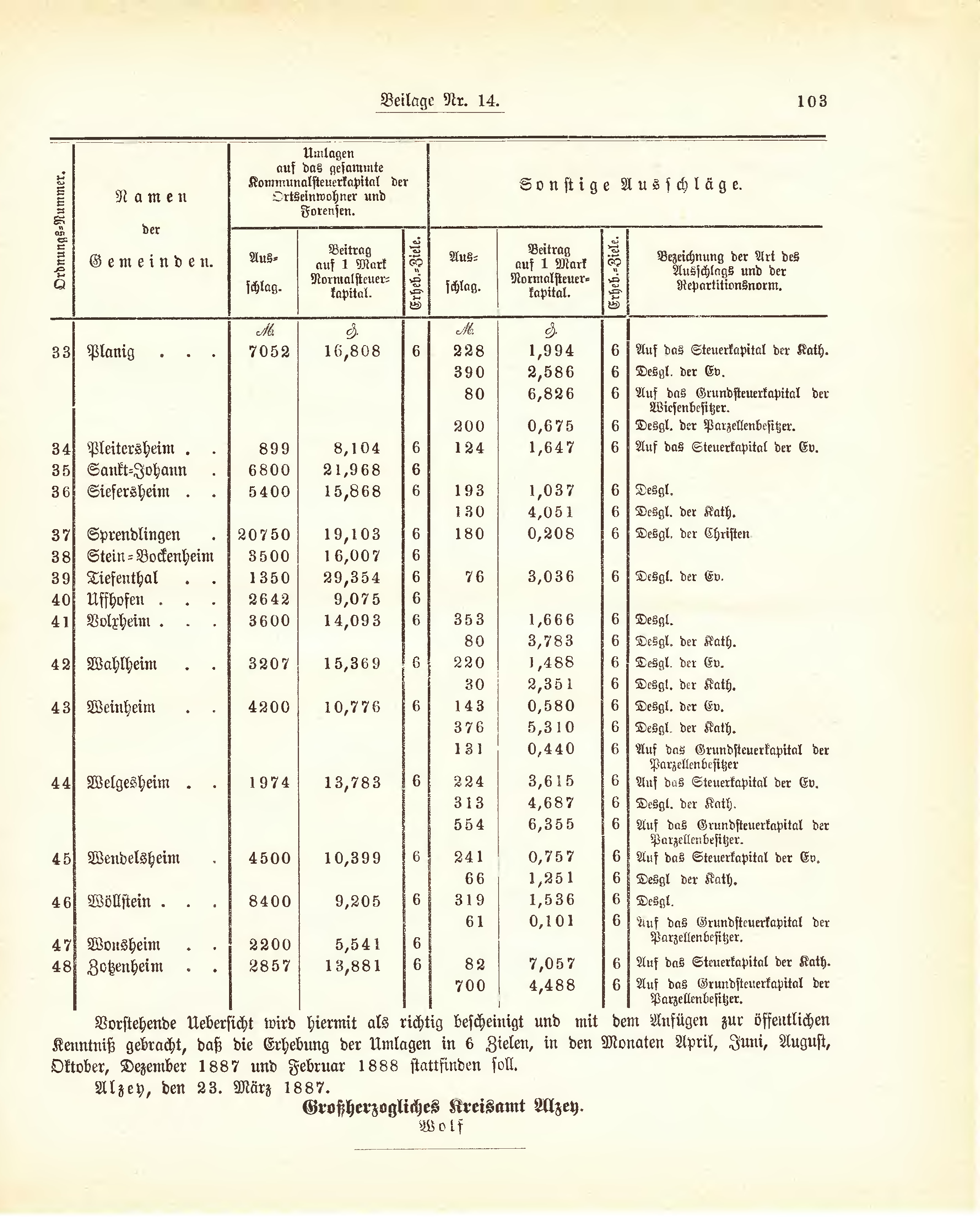 Vorstehende Uebersicht wird hiermit als richtig bescheinigt und mit dem Anfügen zur öffentlichen Kenntniß gebracht, daß die Erhebung der Umlagen in 6 Zielen, in den Monaten April, Juni, August, Oktober, Dezember 1887 und Februar 1888 stattfinden soll.