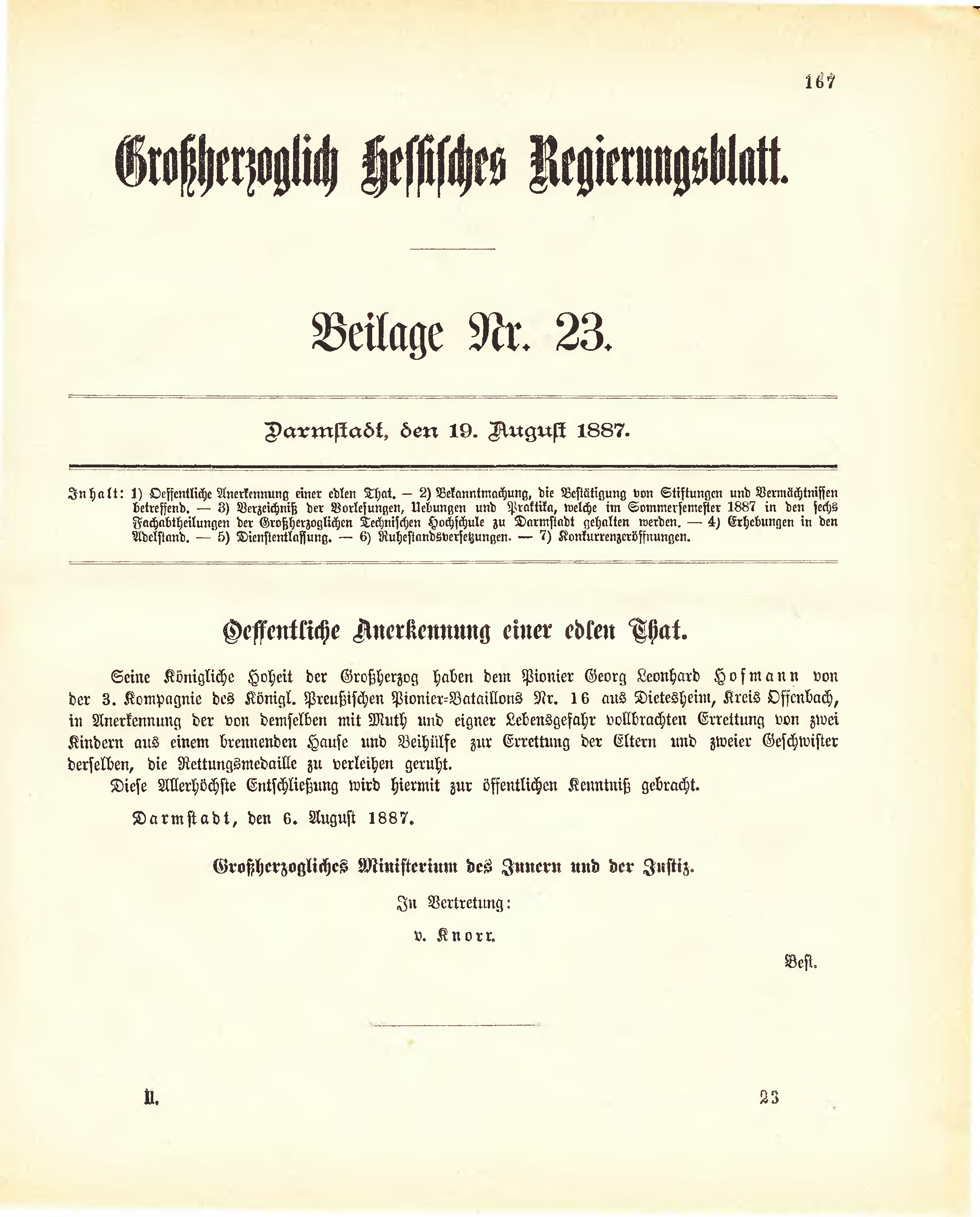 Seine Königliche Hoheit der Großherzog haben dem Pionier Georg Leonhard Hofmann von der 3. Kompagnie des Königl. Preußischen Pionier-Bataillons Nr. 16 aus Dietesheim, Kreis Offenbach, in Anerkennung der von demselben mit Muth und eigner Lebensgefahr vollbrachten Errettung von zwei Kindern aus einem brennenden Hause und Beihülfe zur Errettung der Eltern und zweier Geschwister derselben, die Rettungsmedaille zu verleihen geruht.