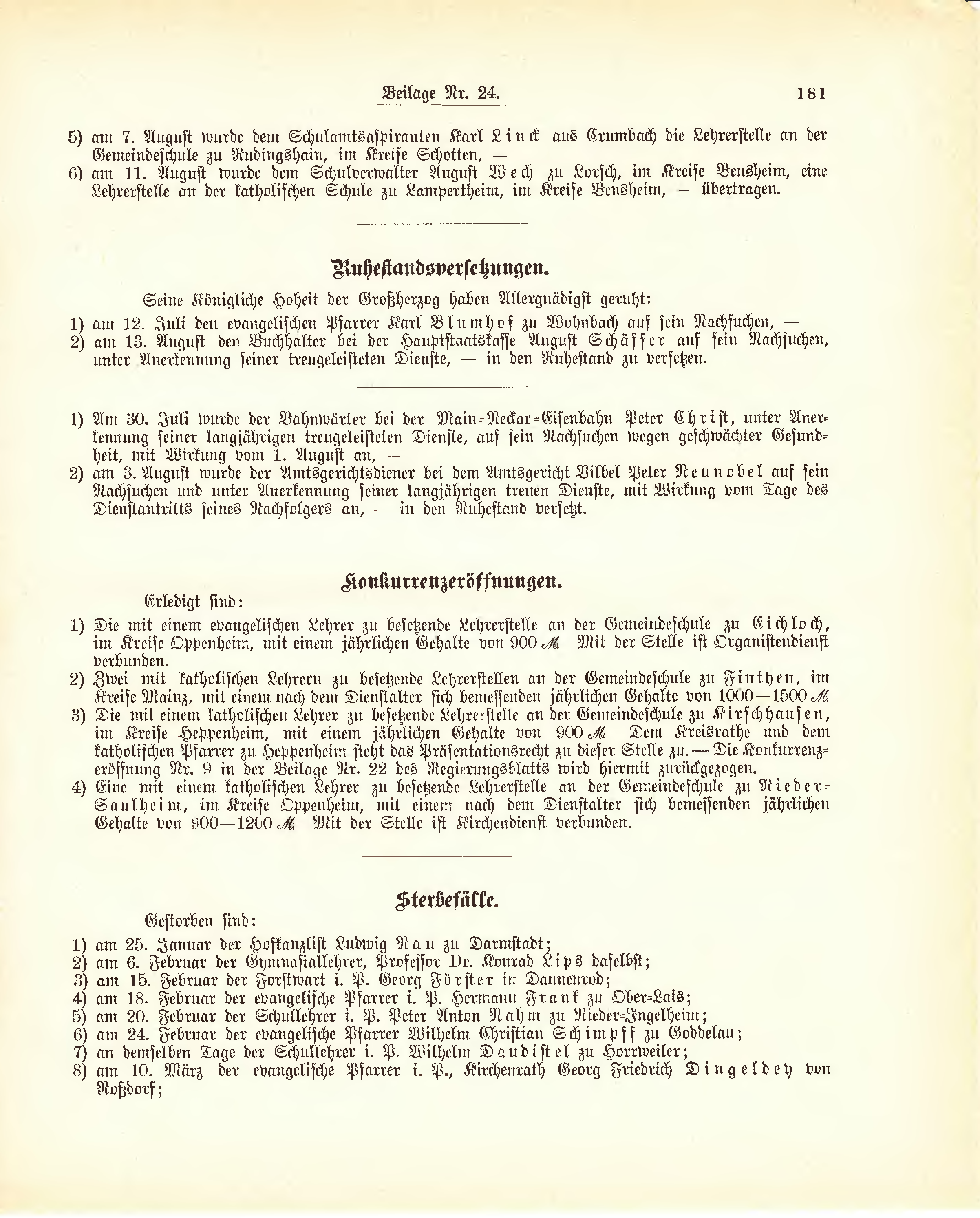 5) am 7. August wurde dem Schulamtsaspiranten Karl Linck aus Crumbach die Lehrerstelle an der Gemeindeschule zu Rudingshain, im Kreise Schotten, -
