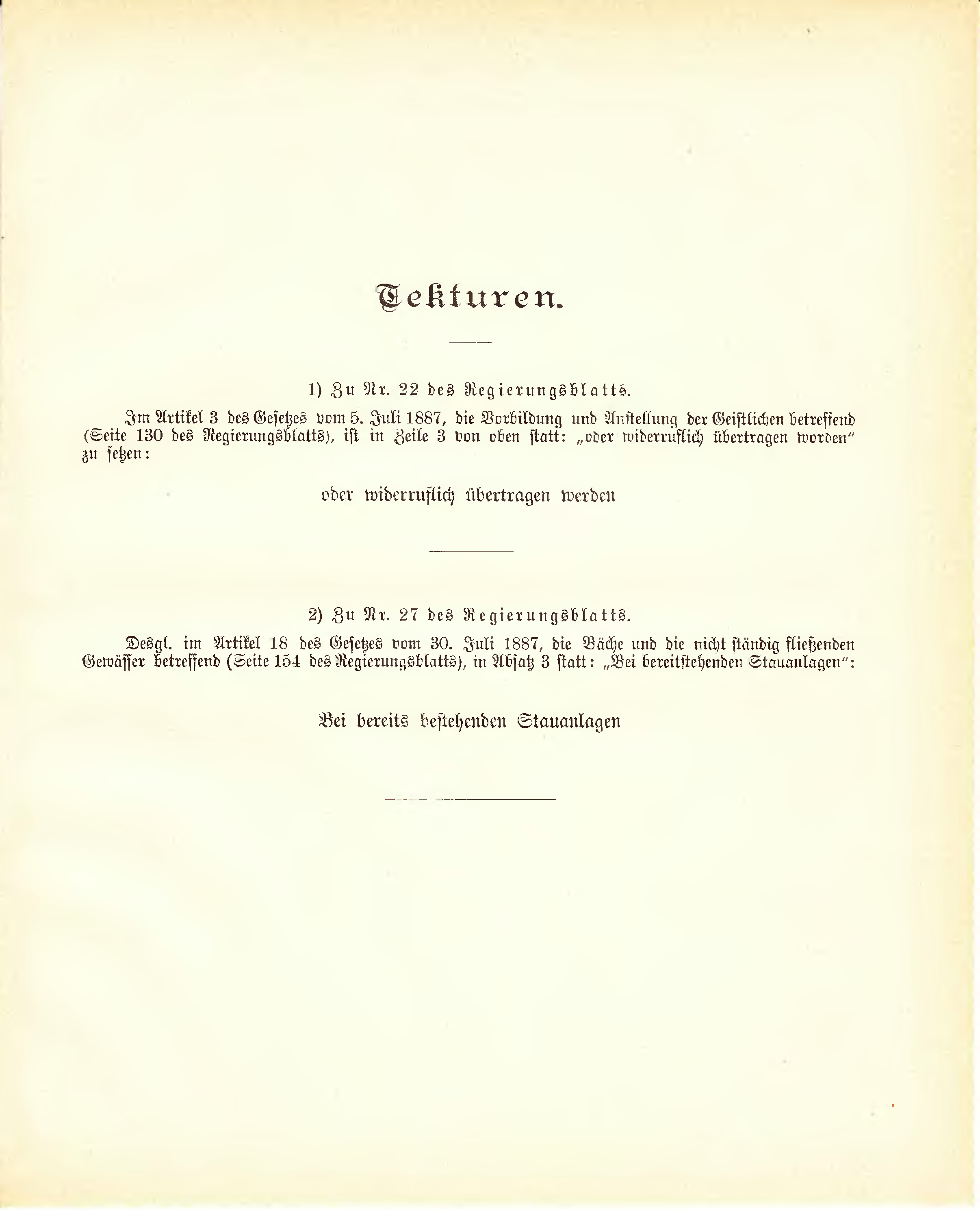 Im Artikel 3 des Gesetzes vom 5. Juli 1887, die Vorbildung und Anstellung der Geistlichen betreffend (Seite 130 des Regierungsblatts), ist in Zeile 3 von oben statt: "oder widerruflich übertragen worden" zu setzen:
