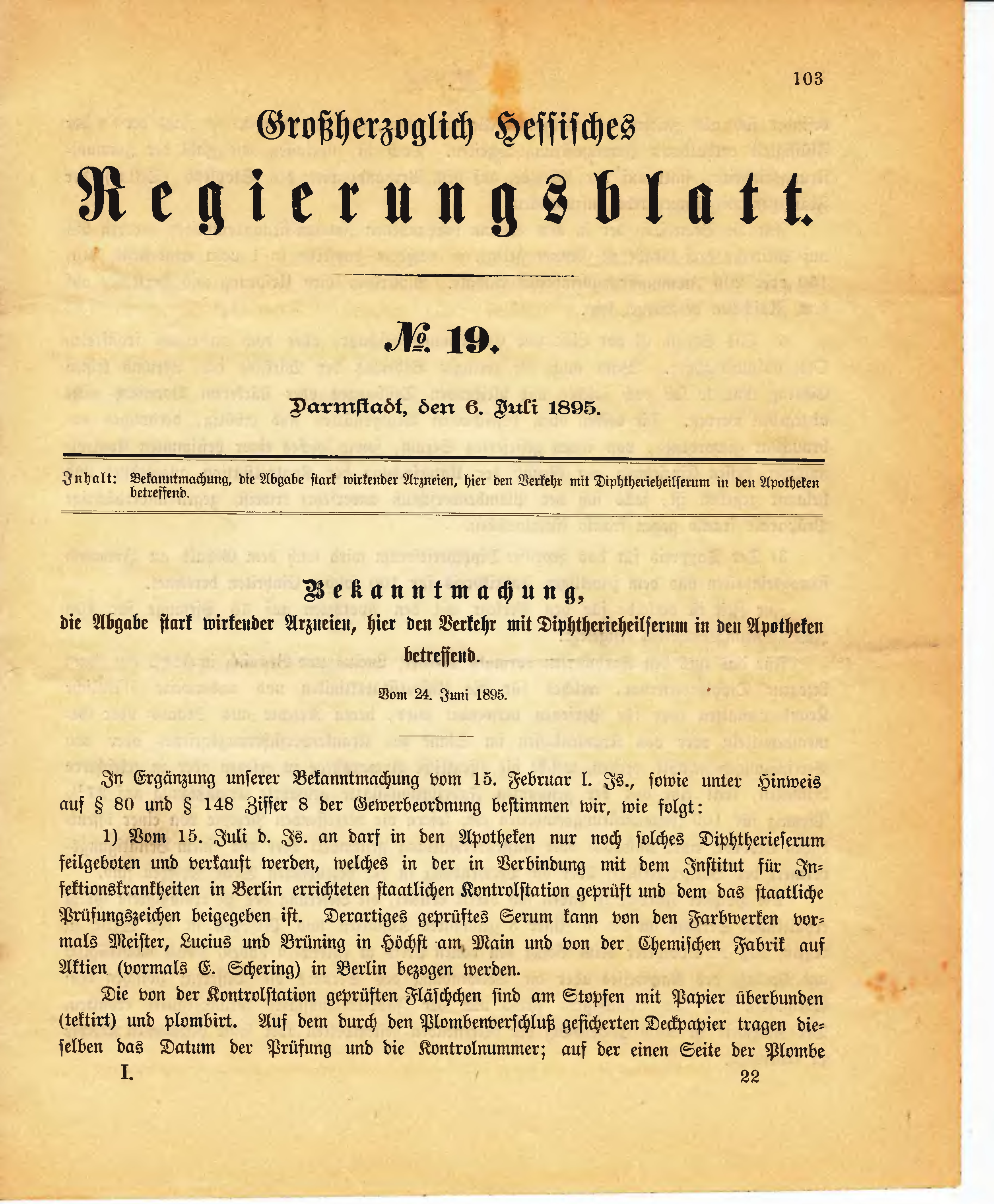 1) Vom 15. Juli d. Js. an darf in den Apotheken nur noch solches Diphtherieserum feilgeboten und verkauft werden, welches in der in Verbindung mit dem Institut für Infektionskrankheiten in Berlin errichteten staatlichen Kontrolstation geprüft und dem das staatliche Prüfungszeichen beigegeben ist. Derartiges geprüftes Serum kann von den Farbwerken vormals Meister, Lucius und Brüning in Höchst am Main und von der Chemischen Fabrik auf Aktien. (vormals E. Schering) in Berlin bezogen werden.