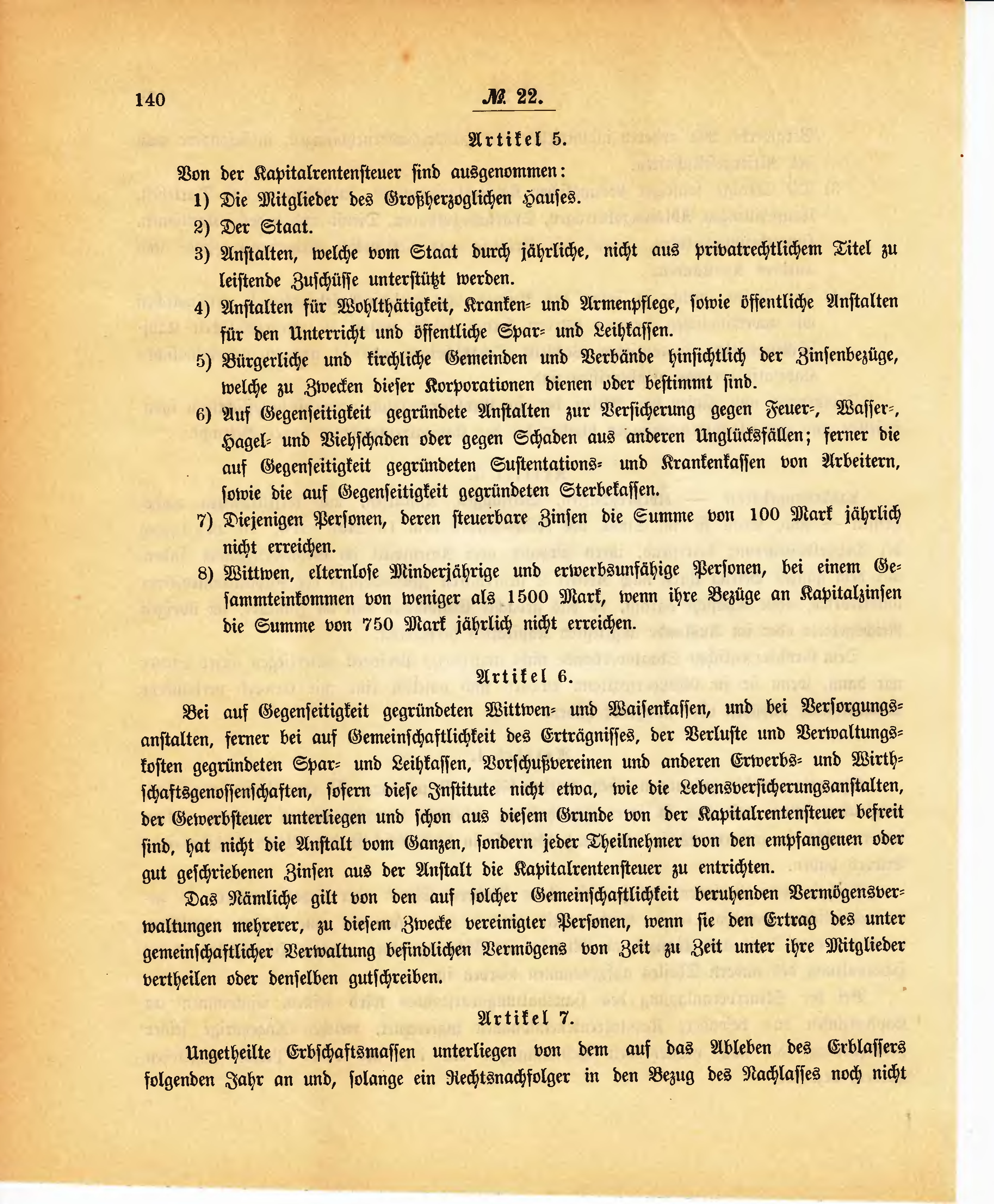 8) Wittwen, elternlose Minderjährige und erwerbsunfähige Personen, bei einem Gesammteinkommen von weniger als 1500 Mark, wenn ihre Bezüge an Kapitalzinsen die Summe von 750 Mark jährlich nicht erreichen.