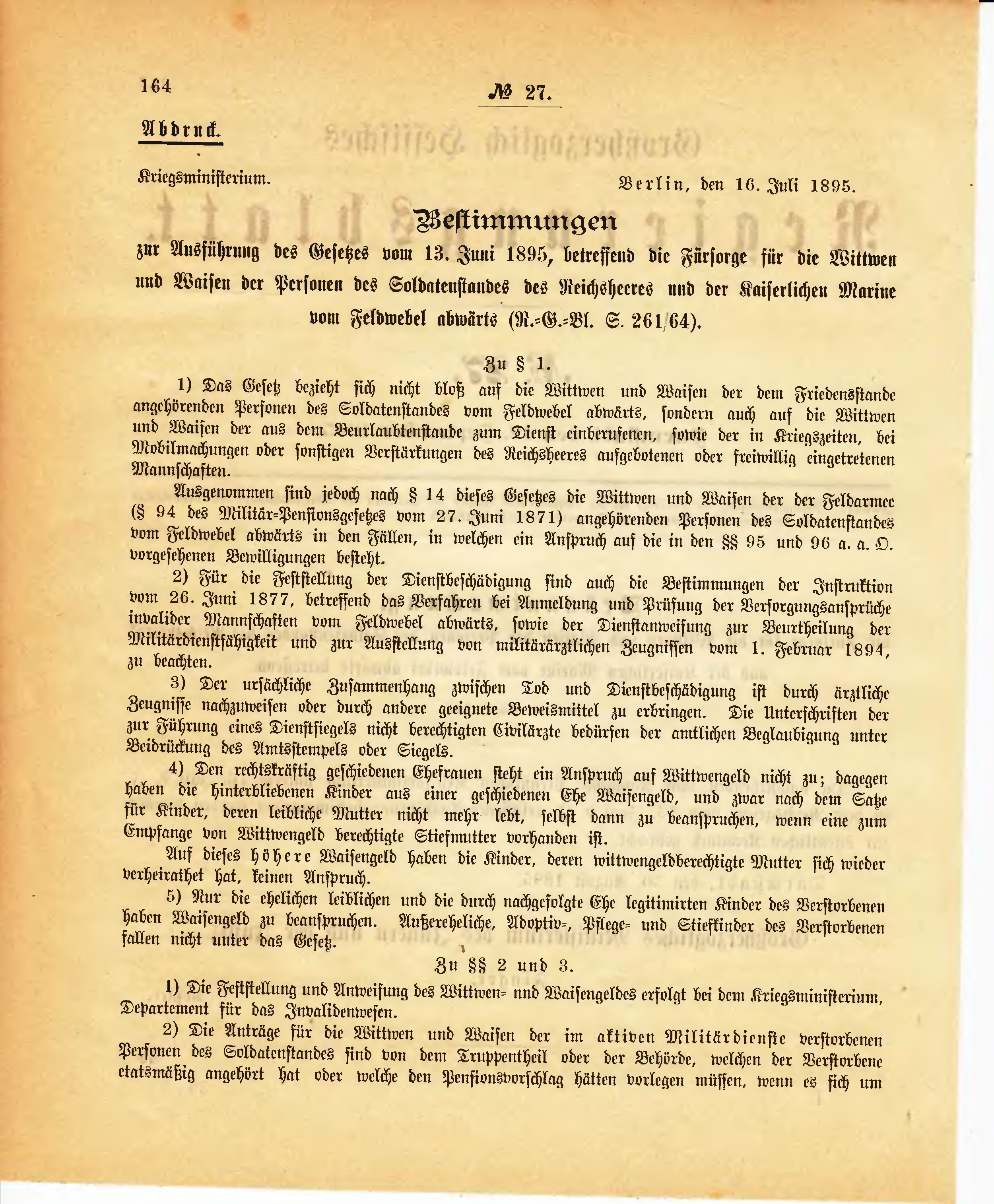 zur Ausführung des Gesetzes vom 13. Juni 1895, betreffend die Fürsorge für die Wittwen und Waisen der Personen des Soldatenstandes des Reichsheeres und der Kaiserlichen Marine vom Feldwebel abwärts (R.-G.-Bl. S. 261/64).