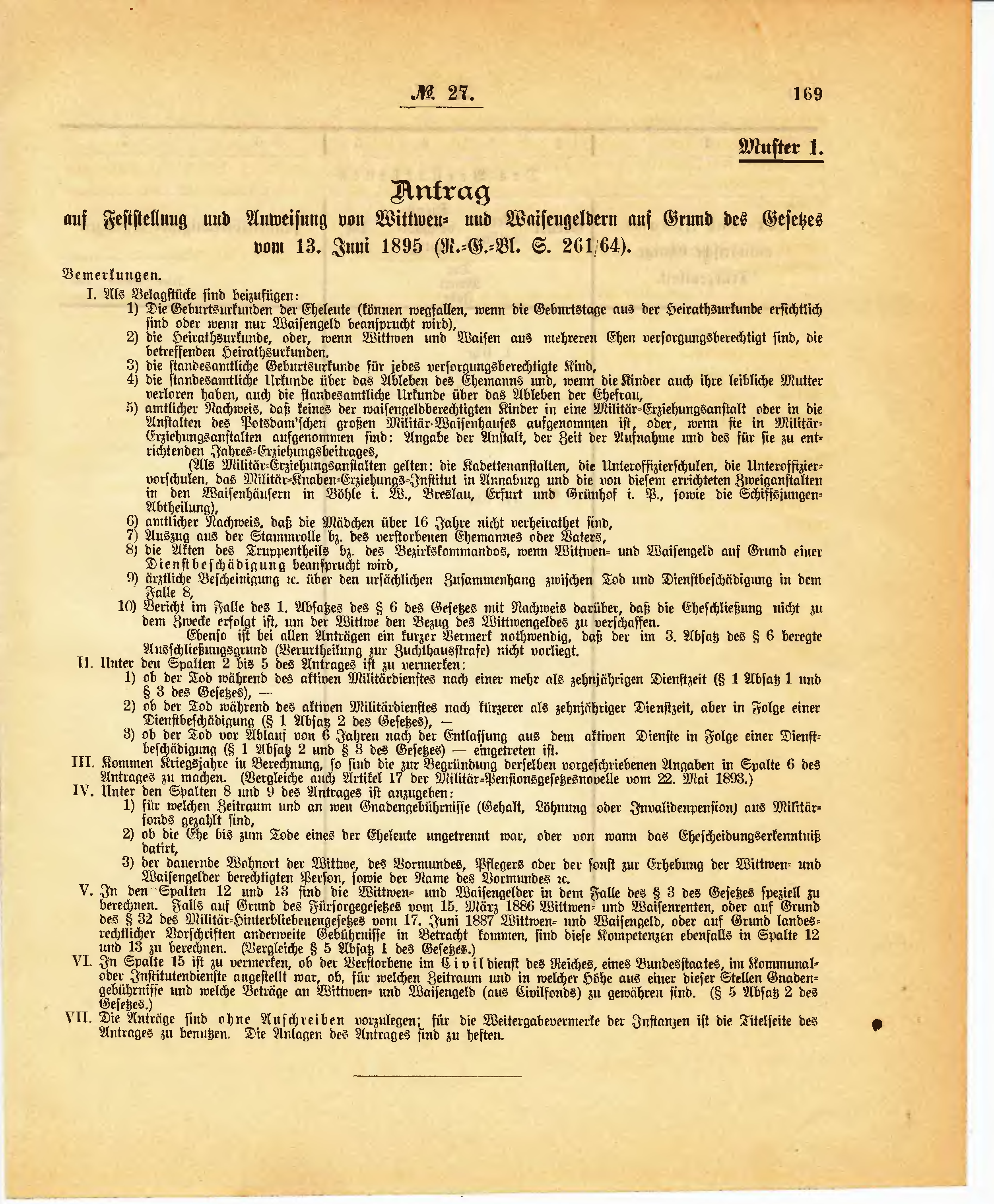auf Feststellung und Anweisung von Wittwen- und Waisengeldern auf Grund des Gesetzes vom 13. Juni 1895 (R.-G.-Bl. S. 261/64).