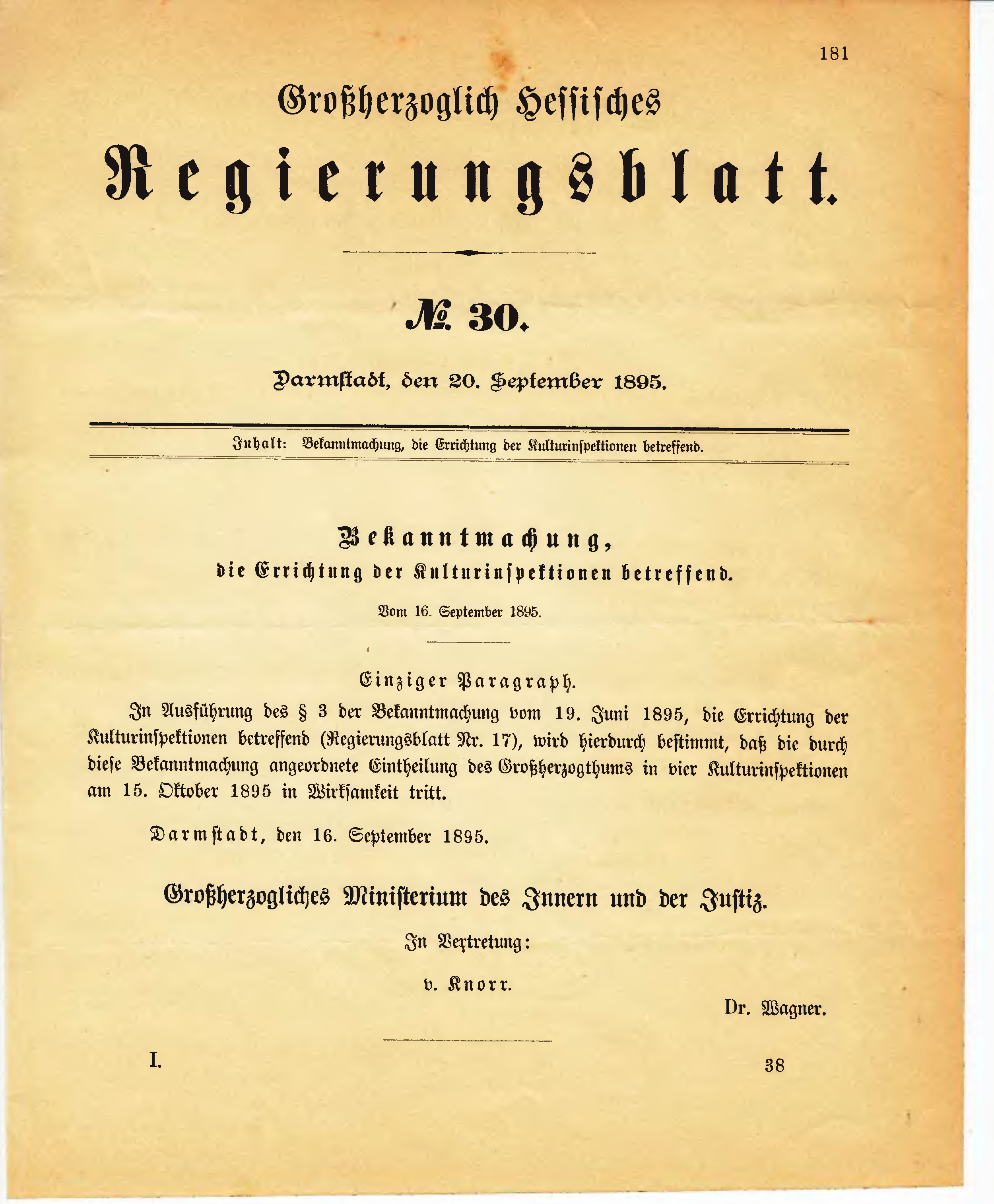 In Ausführung des § 3 der Bekanntmachung vom 19. Juni 1895, die Errichtung der Kulturinspektionen betreffend (Regierungsblatt Nr. 17), wird hierdurch bestimmt, daß die durch diese Bekanntmachung angeordnete Eintheilung des Großherzogthums in vier Kulturinspektionen am 15. Oktober 1895 in Wirksamkeit tritt.