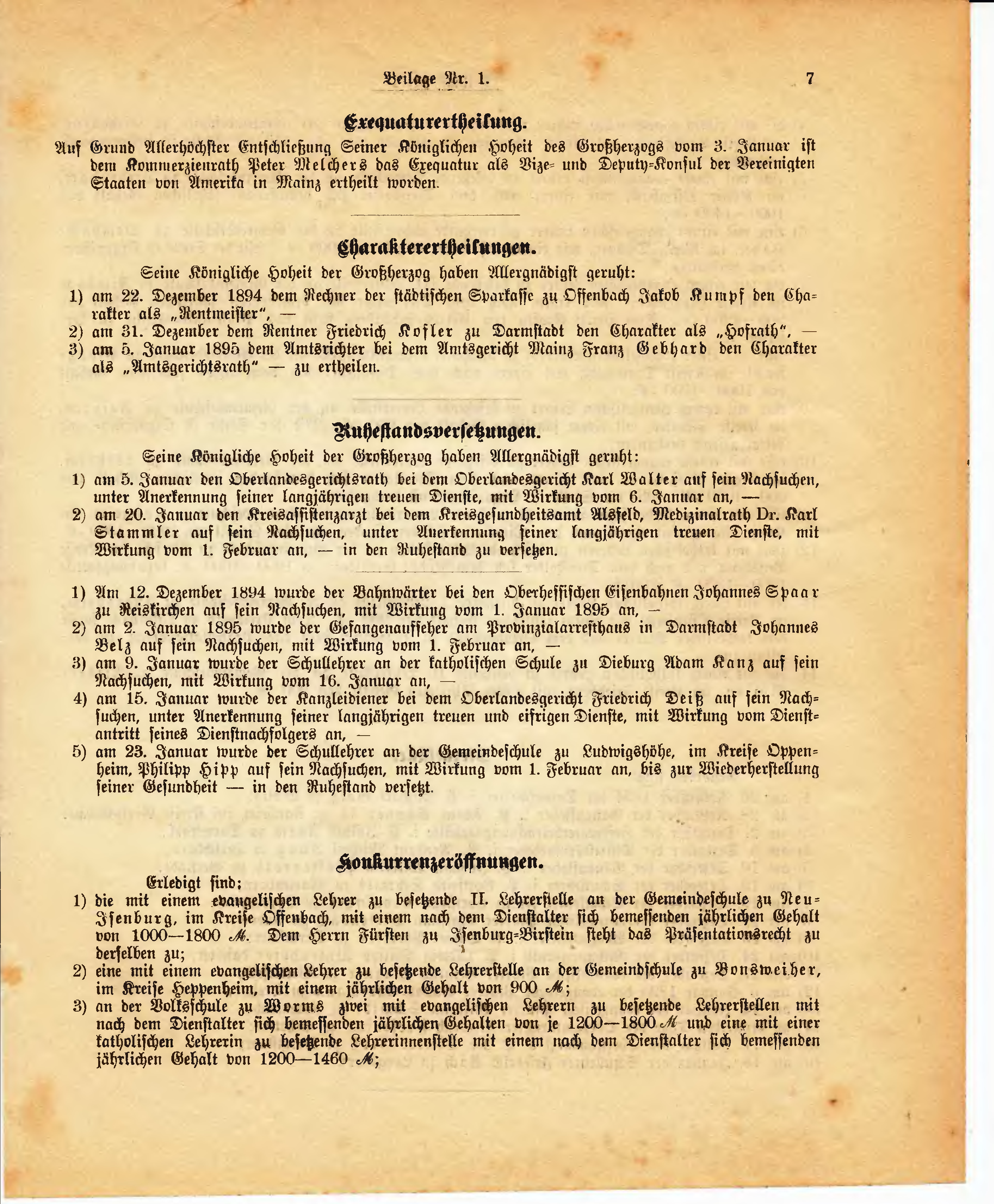 | 3) | am 5. Januar 1895 dem Amtsrichter bei dem Amtsgericht Mainz Franz Gebhard den Charakter als "Amtsgerichtsrath" - zu ertheilen. | |