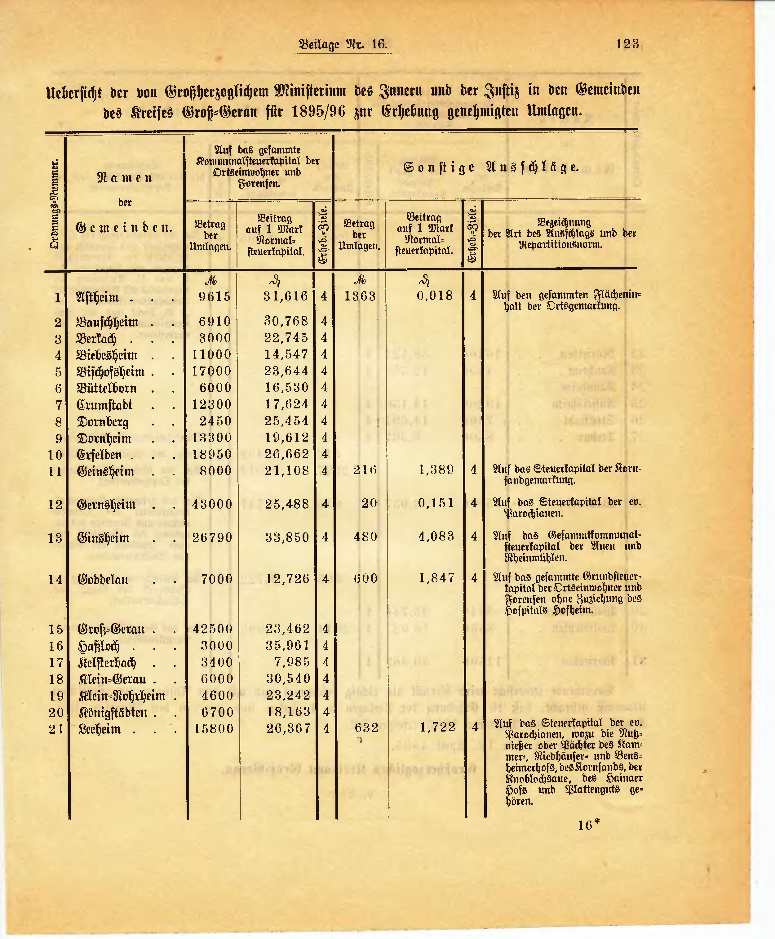 Uebersicht der von Großherzoglichem Ministerium des Innern und der Justiz in den Gemeinden des Kreises Groß-Gerau für 1895/96 zur Erhebung genehmigten Umlagen.
