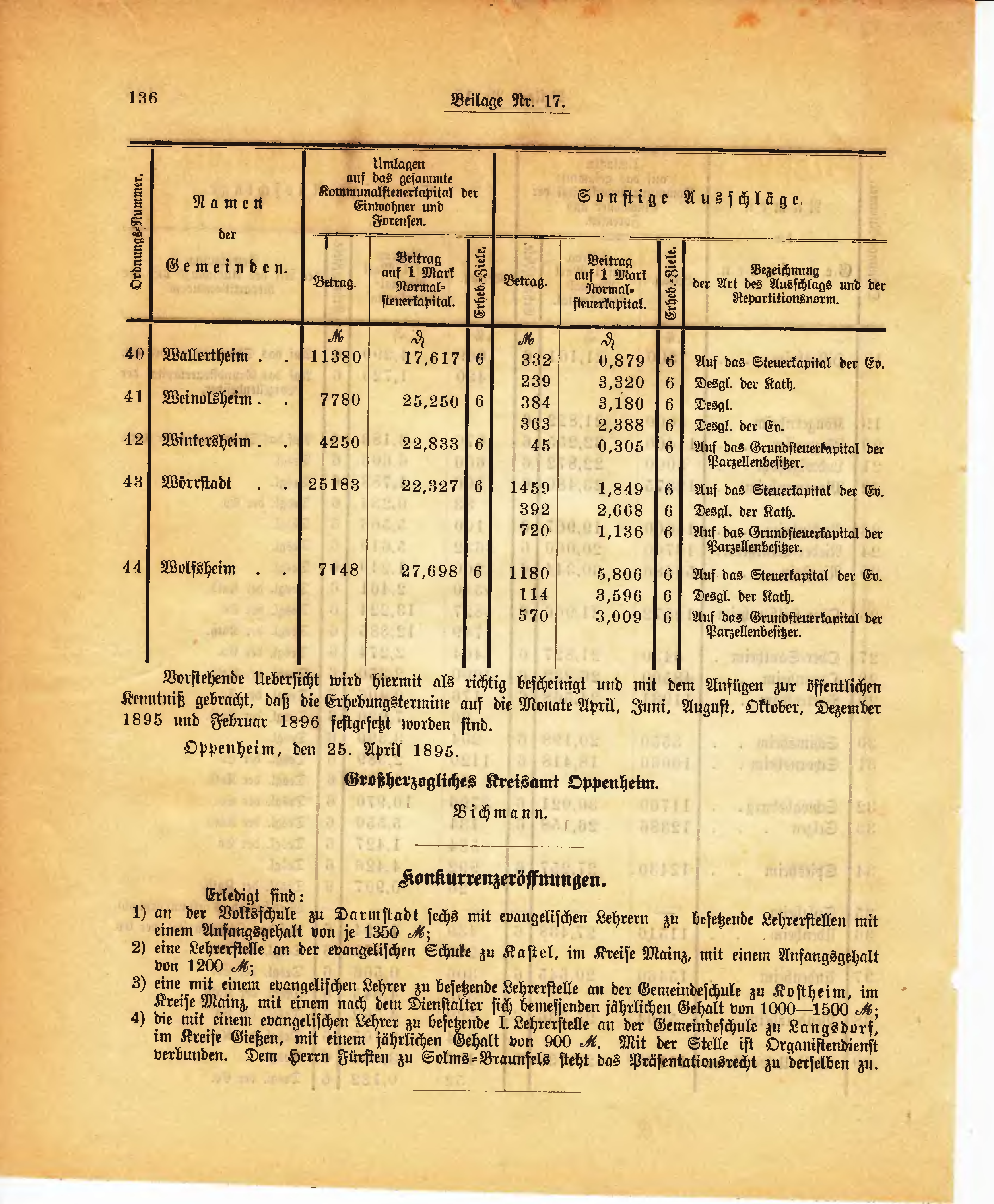 Vorstehende Uebersicht wird hiermit als richtig bescheinigt und mit dem Anfügen zur öffentlichen Kenntniß gebracht, daß die Erhebungstermine auf die Monate April, Juni, August, Oktober, Dezember 1895 und Februar 1896 festgesetzt worden sind.