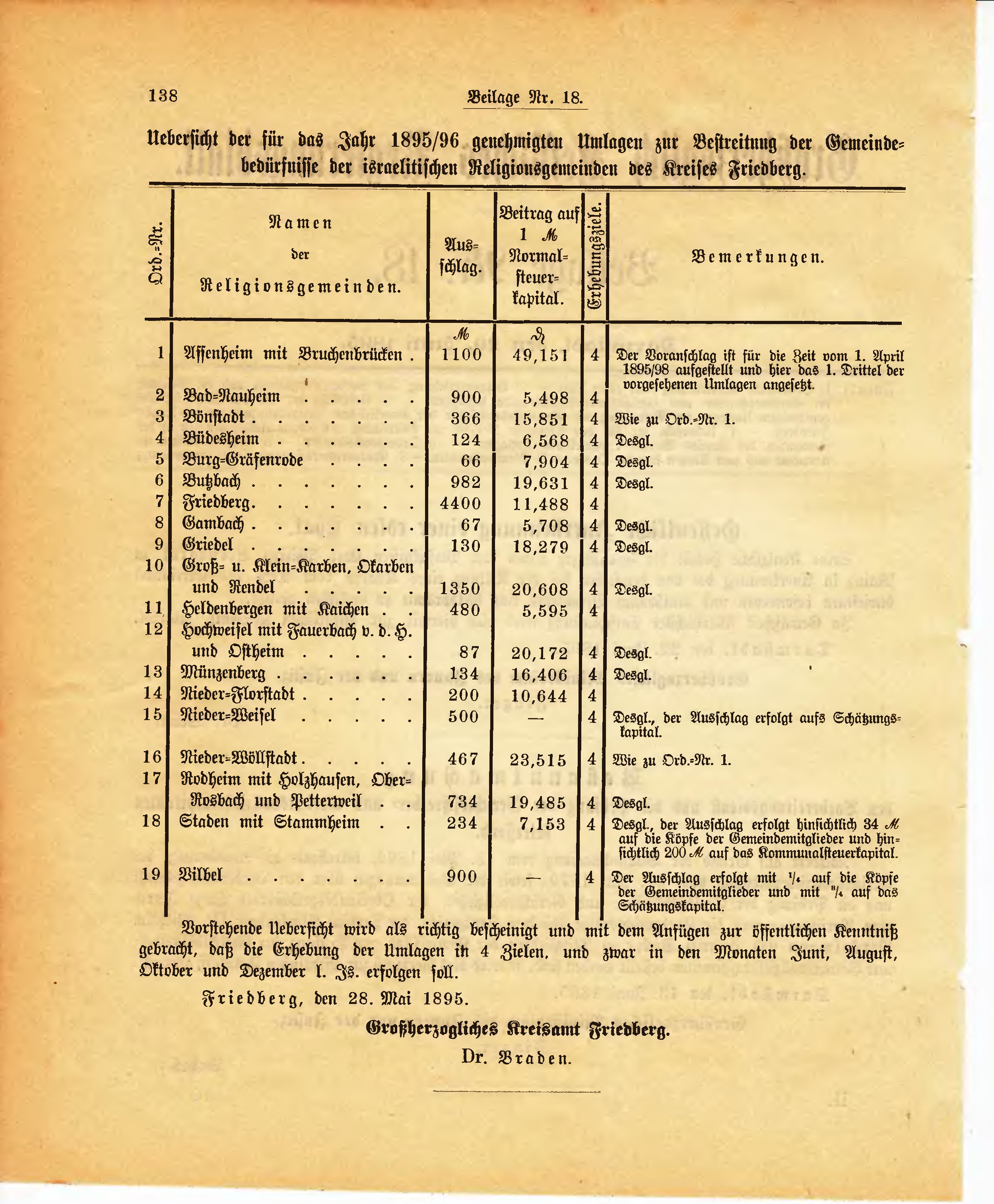 Uebersicht der für das Jahr 1895/96 genehmigten Umlagen zur Bestreitung der Gemeindebedürfnisse der israelitischen Religionsgemeinden des Kreises Friedberg.