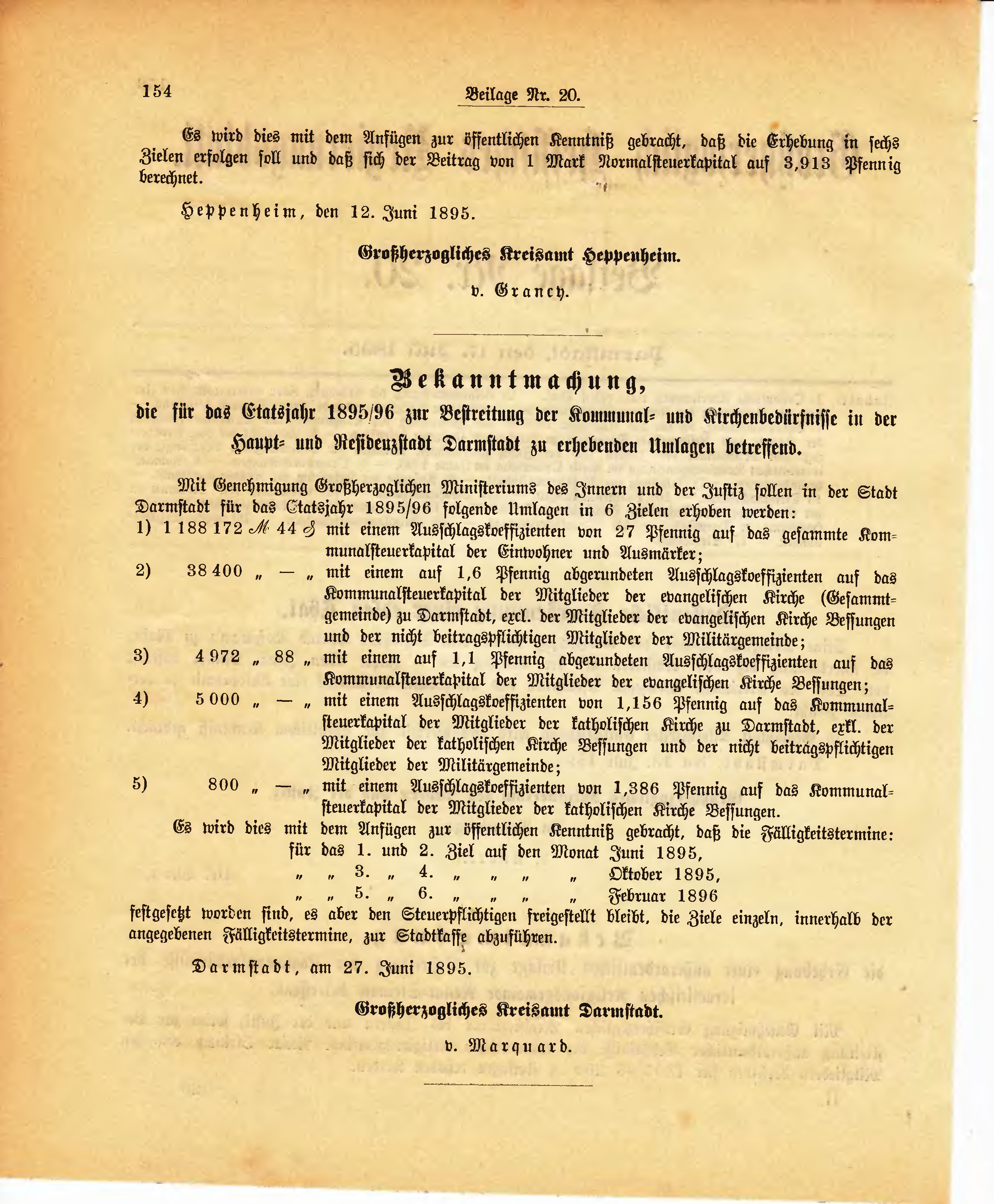 Mit Genehmigung Großherzoglichen Ministeriums des Innern und der Justiz sollen in der Stadt Darmstadt für das Etatsjahr 1895/96 folgende Umlagen in 6 Zielen erhoben werden: