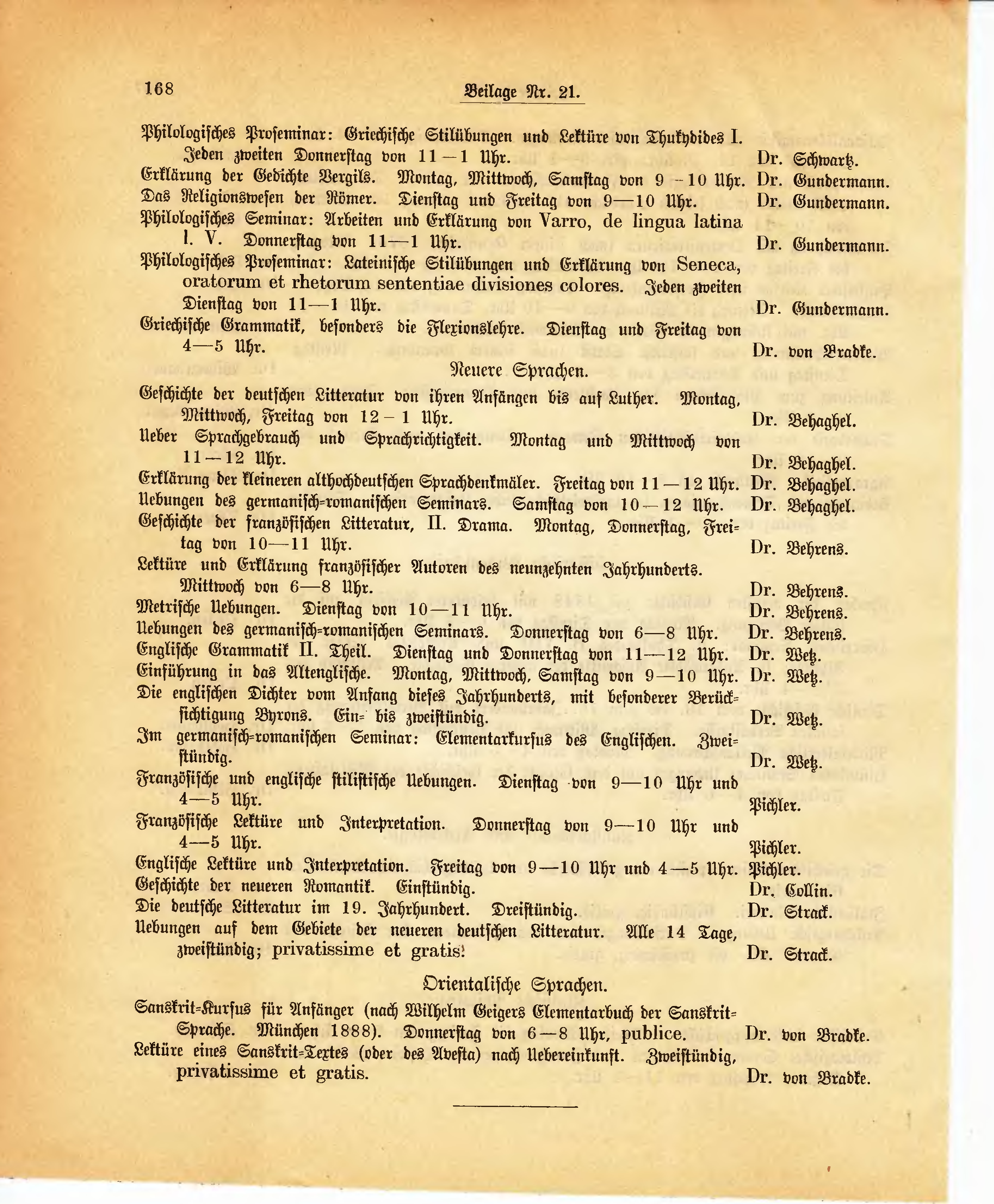 Sanskrit-Kursus für Anfänger (nach Wilhelm Geigers Elementarbuch der Sanskrit-Sprache. München 1888). Donnerstag von 6-8 Uhr, publice". Dr. von Bradke.