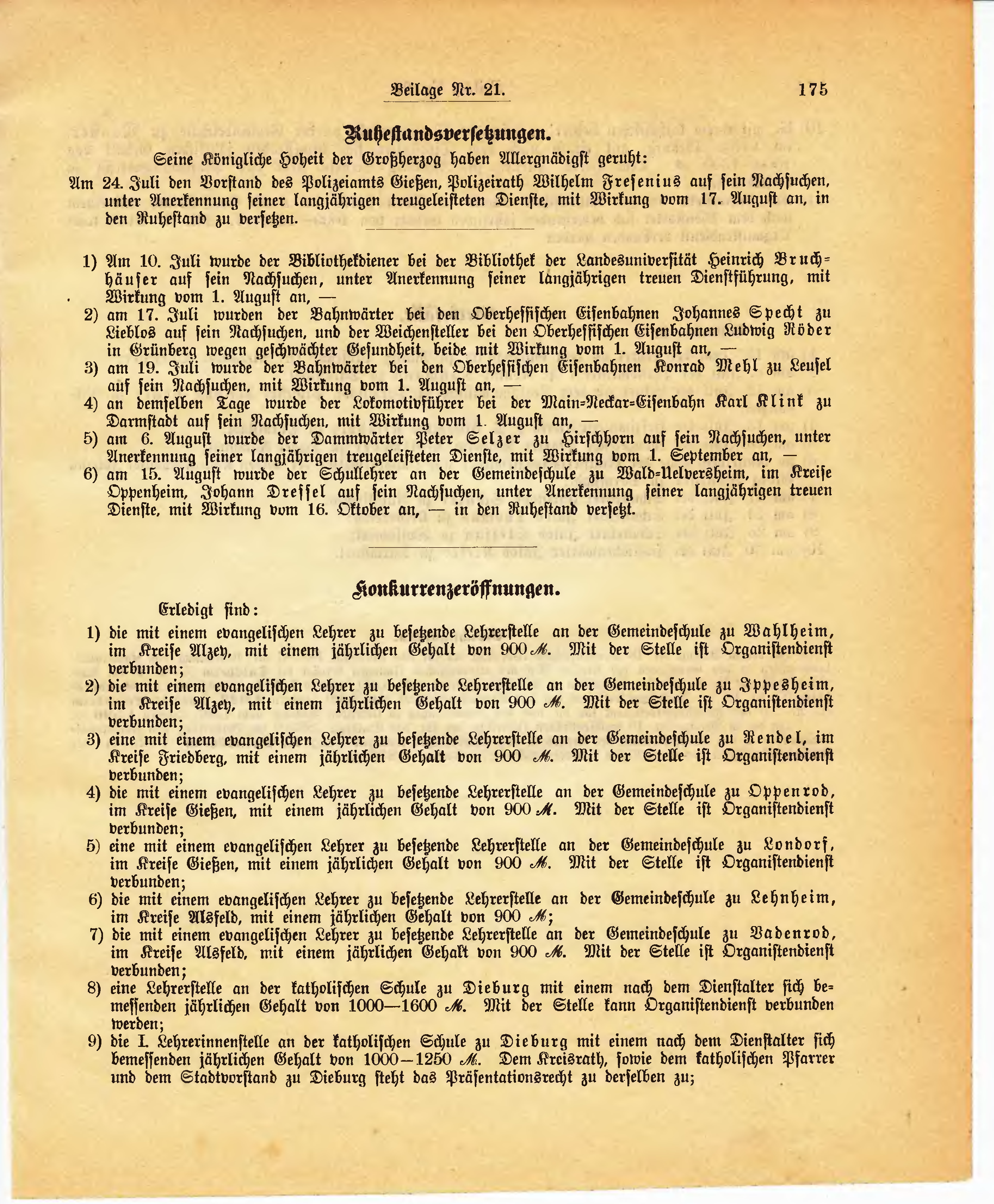 | 6) | am 15. August wurde der Schullehrer an der Gemeindeschule zu Wald-Uelversheim, im Kreise Oppenheim, Johann Dressel auf sein Nachsuchen, unter Anerkennung seiner langjährigen treuen Dienste, mit Wirkung vom 16. Oktober an, - in den Ruhestand versetzt. |