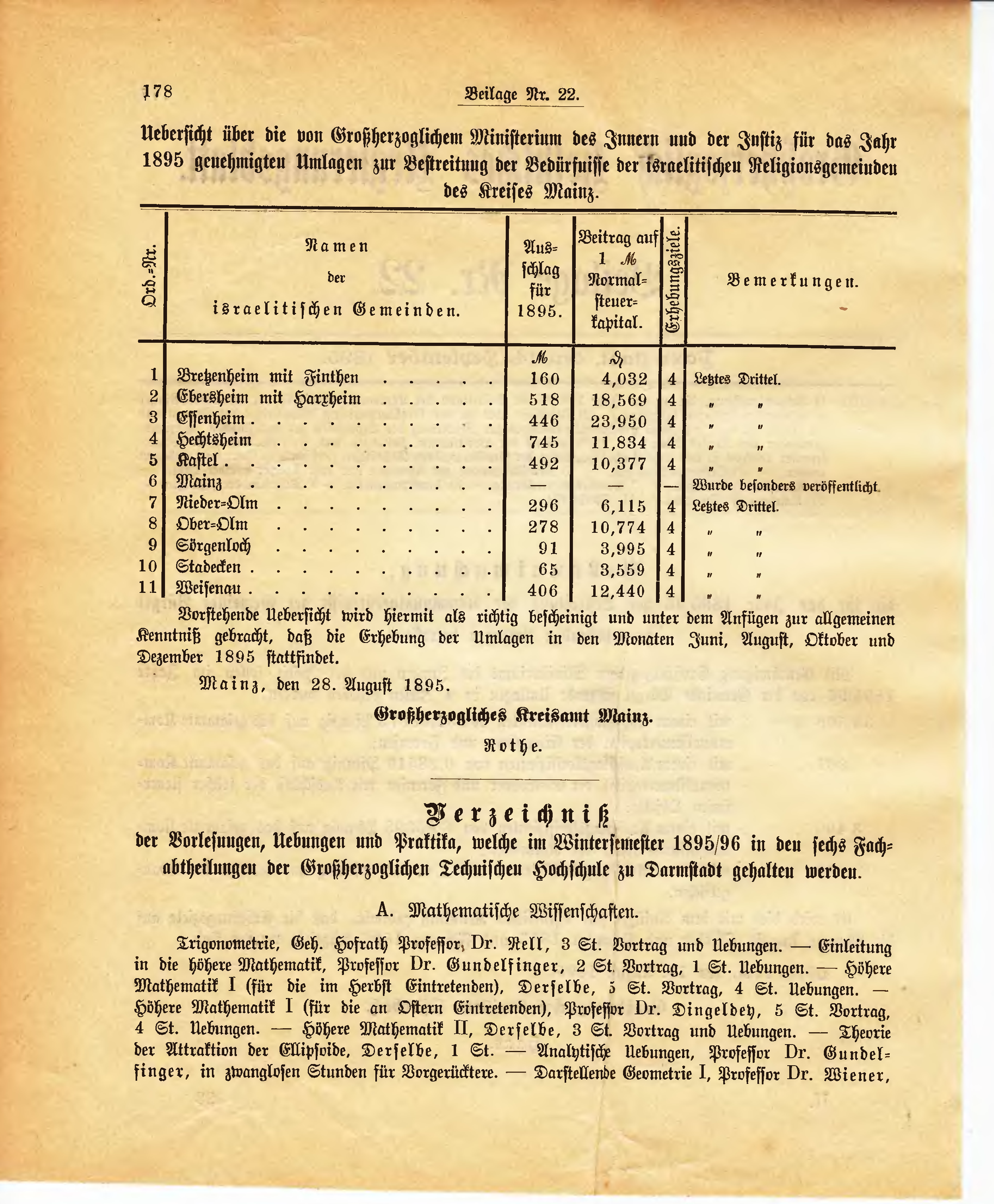 Uebersicht über die von Großherzoglichem Ministerium des Innern und der Justiz für das Jahr 1895 genehmigten Umlagen zur Bestreitung der Bedürfnisse der israelitischen Religionsgemeinden des Kreises Mainz.