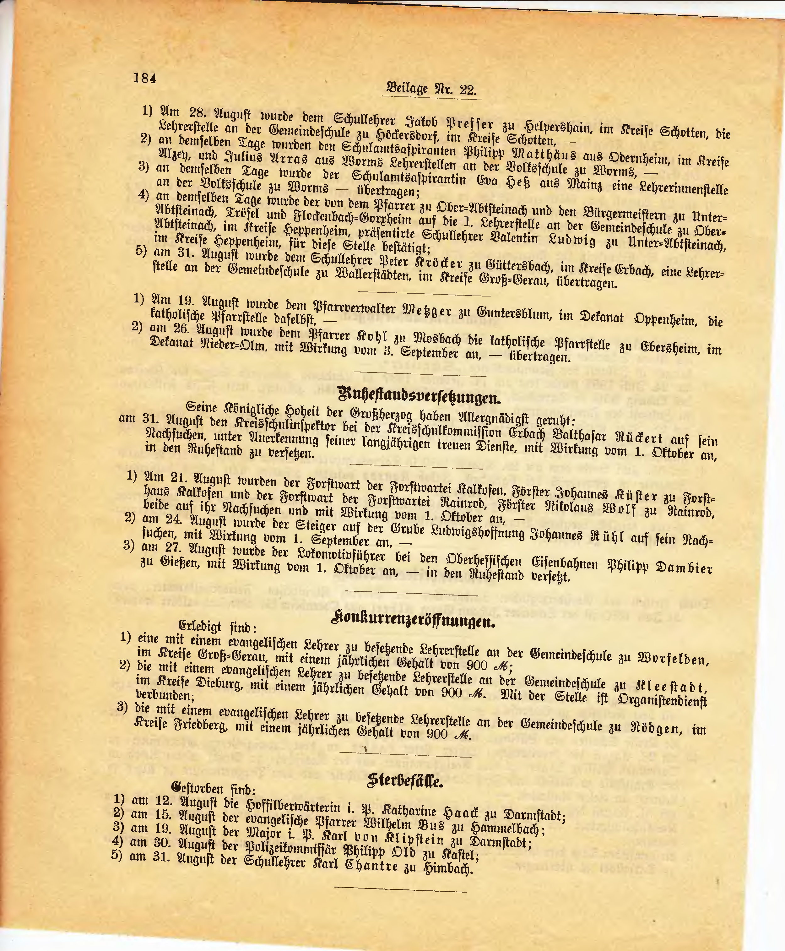 1) Am 28. August wurde dem Schullehrer Jakob Presser zu Helpershain, im Kreise Schotten, Lehrerstelle an der Gemeindeschule zu Höckersdorf, im Kreise Schotten, -