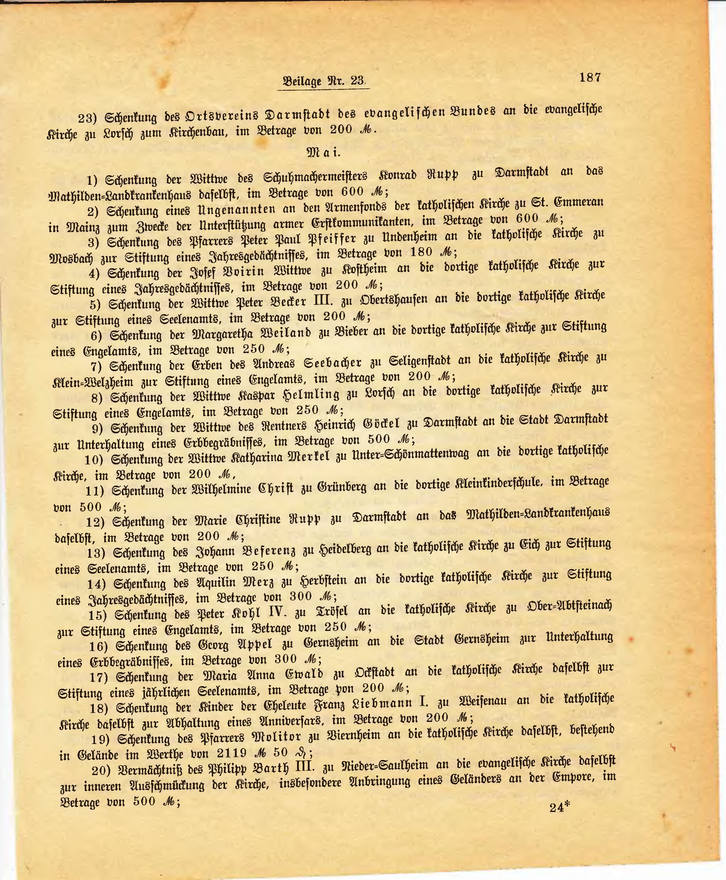 23) Schenkung des Ortsvereins Darmstadt des evangelischen Bundes an die evangelische Kirche zu Lorsch zum Kirchenbau, im Betrage von 200
