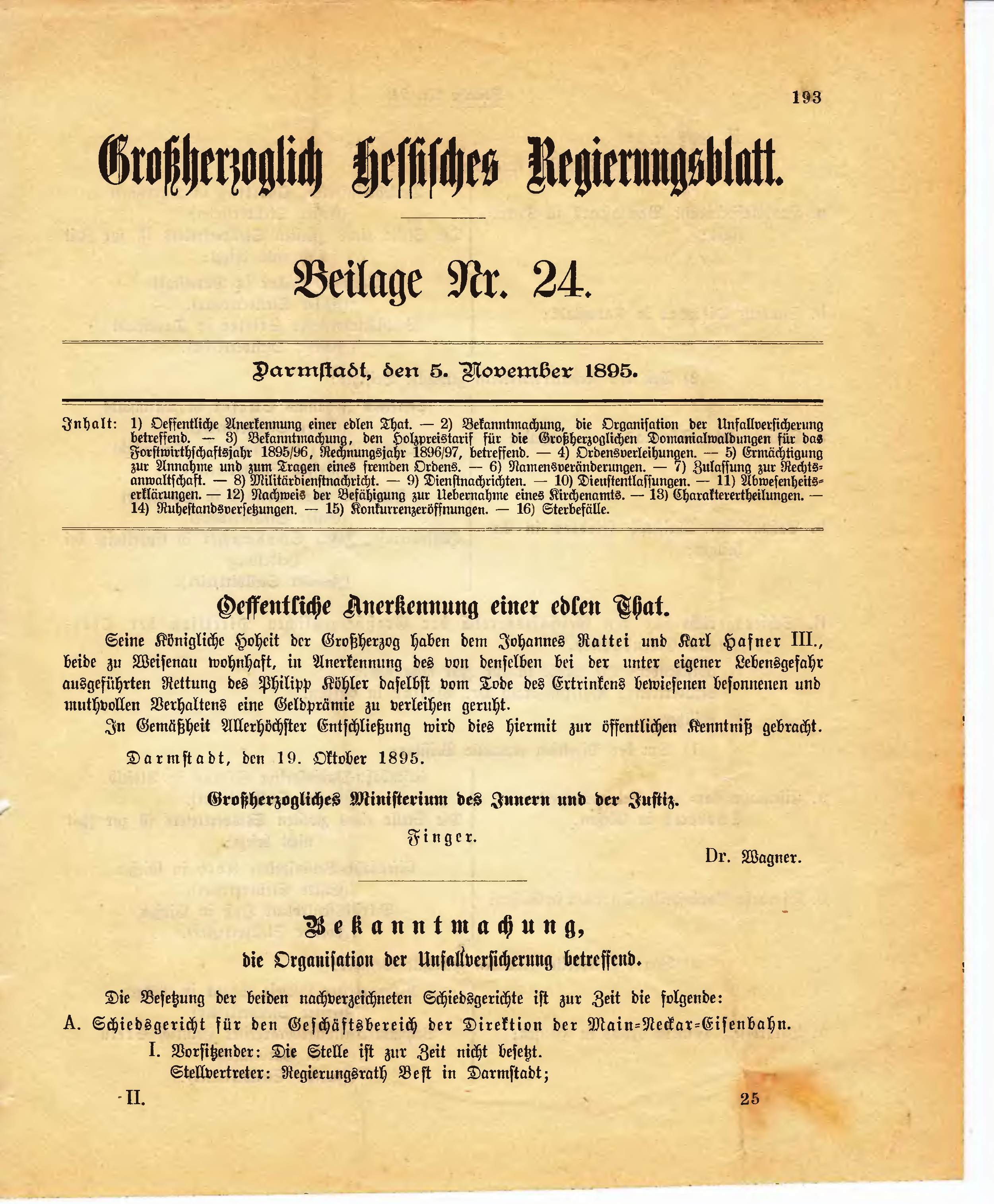 | Inhalt: | 1) Oeffentliche Anerkennung einer edlen That. - 2) Bekanntmachung, die Organisation der Unfallversicherung betreffend. - 3) Bekanntmachung, den Holzpreistarif für die Großherzoglichen Domanialwaldungen für das Forstwirthschaftsjahr 1895/96, Rechnungsjahr 1896/97, betreffend. - 4) Ordensverleihungen. - 5) Ermächtigung zur Annahme und zum Tragen eines fremden Ordens. - 6) Namensveränderungen. - 7) Zulassung zur Rechtsanwaltschaft. - 8) Militärdienstnachricht. - 9) Dienstnachrichten. - 10) Dienstentlassungen. - 11) Abwesenheitserklärungen. - 12) Nachweis der Befähigung zur Uebernahme eines Kirchenamts. - 13) Charakterertheilungen. - 14) Ruhestandsversetzungen. - 15) Konkurrenzeröffnungen. - 16) Sterbefälle. |