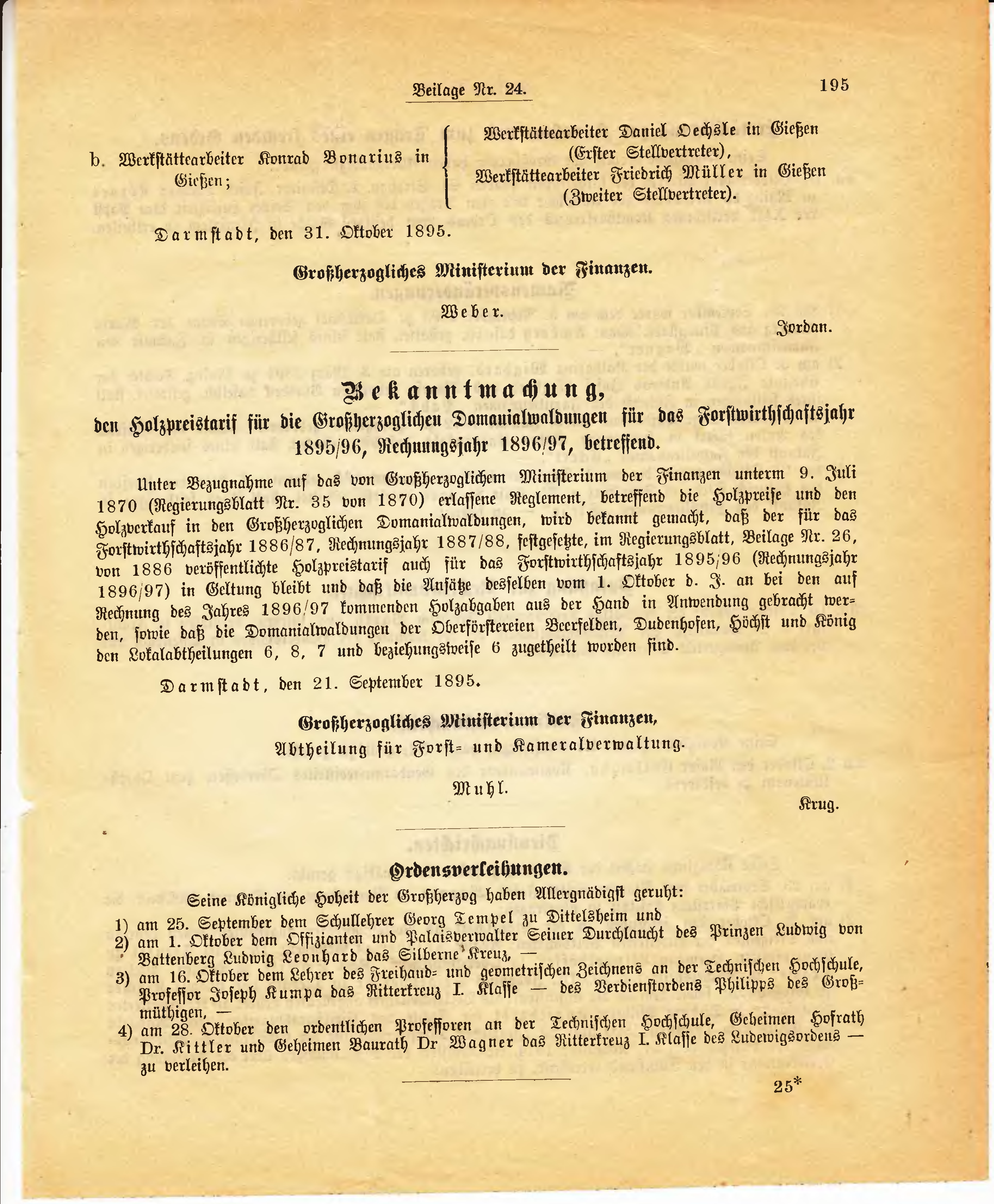 Unter Bezugnahme auf das von Großherzoglichem Ministerium der Finanzen unterm 9. Juli 1870 (Regierungsblatt Nr. 35 von 1870) erlassene Reglement, betreffend die Holzpreise und den Holzverkauf in den Großherzoglichen Domanialwaldungen, wird bekannt gemacht, daß der für das Forstwirthschaftsjahr 1886/87, Rechnungsjahr 1887/88, festgesetzte, im Regierungsblatt, Beilage Nr. 26, von 1886 veröffentlichte Holzpreistarif auch für das Forstwirthschaftsjahr 1895/96 (Rechnungsjahr 1896/97) in Geltung bleibt und daß die Ansätze desselben vom 1. Oktober d. J. an bei den auf Rechnung des Jahres 1896/97 kommenden Holzabgaben aus der Hand in Anwendung gebracht werden, sowie daß die Domanialwaldungen der Oberförstereien Beerfelden, Dudenhofen, Höchst und König den Lokalabtheilungen 6, 8, 7 und beziehungsweise 6 zugetheilt worden sind.
