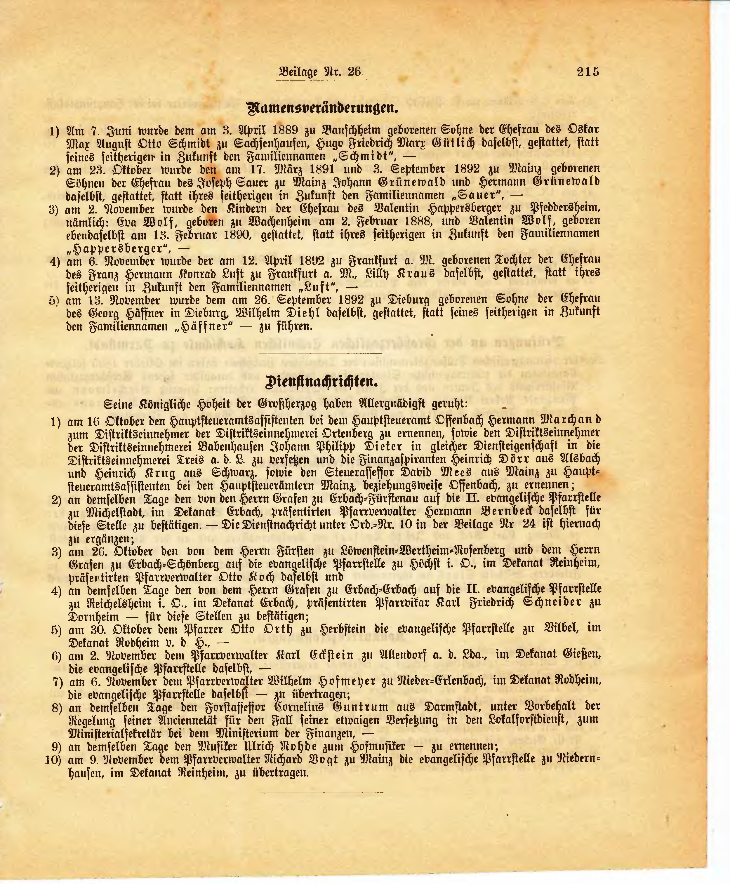 | 3) | am 2. November wurde den Kindern der Ehefrau des Valentin Happersberger zu Pfeddersheim, nämlich: Eva Wolf, geboren zu Wachenheim am 2. Februar 1888, und Valentin Wolf, geboren ebendaselbst am 13. Februar 1890, gestattet, statt ihres seitherigen in Zukunft den Familiennamen "Happersberger", - |