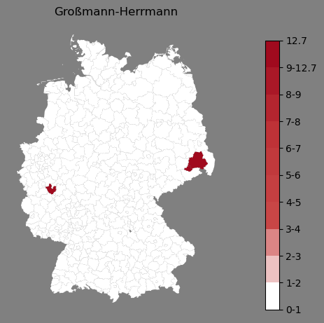 Relative Verteilung des Namens Großmann-Herrmann (1996)Direkt zur Karte Die Farbskala zeigt die Anzahl von "Großmann-Herrmann" bezogen auf je 1 Million Einträge. |