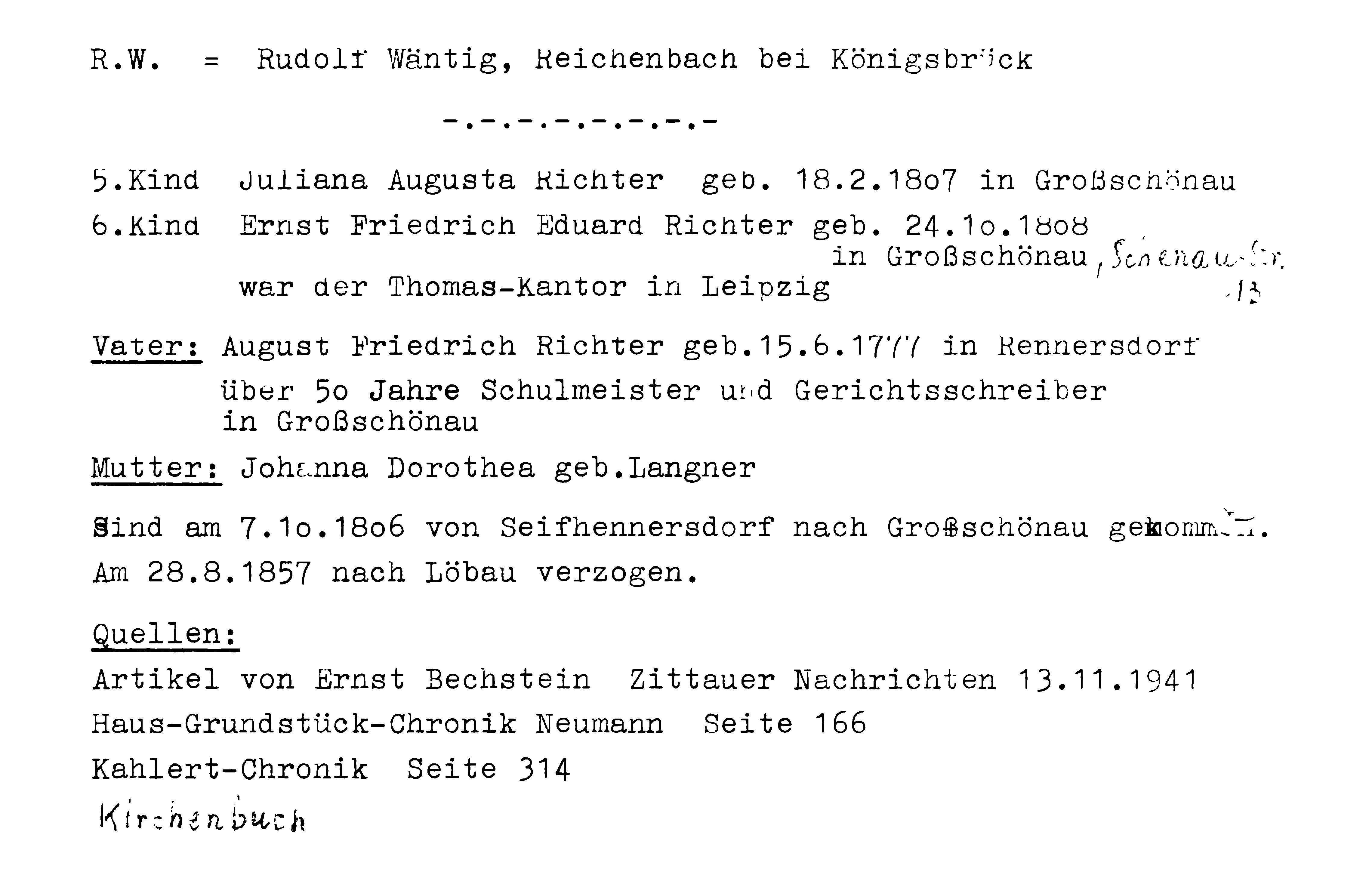 5.Kind Juliana Augusta Richter geb. 18.2.1807 in Großschönau 6.Kind Ernst Friedrich Eduard Richter geb. 24.10.1808 in Großschönau, Schenaustr. 13, war der Thomas-Kantor in Leipzig