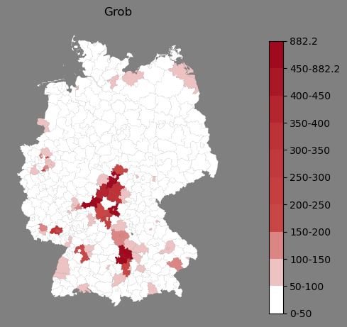 Relative Verteilung des Namens Grob (1996)Direkt zur Karte Die Farbskala zeigt die Anzahl von "Grob" bezogen auf je 1 Million Einträge. |