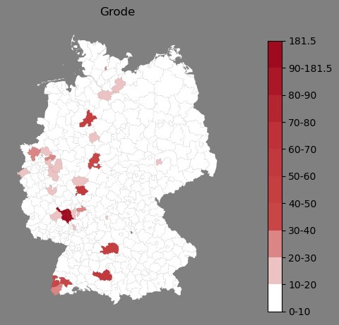 Relative Verteilung des Namens Grode (1996)Direkt zur Karte Die Farbskala zeigt die Anzahl von "Grode" bezogen auf je 1 Million Einträge. |