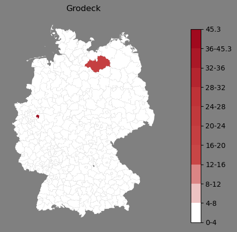 Relative Verteilung des Namens Grodeck (1996)Direkt zur Karte Die Farbskala zeigt die Anzahl von "Grodeck" bezogen auf je 1 Million Einträge. |